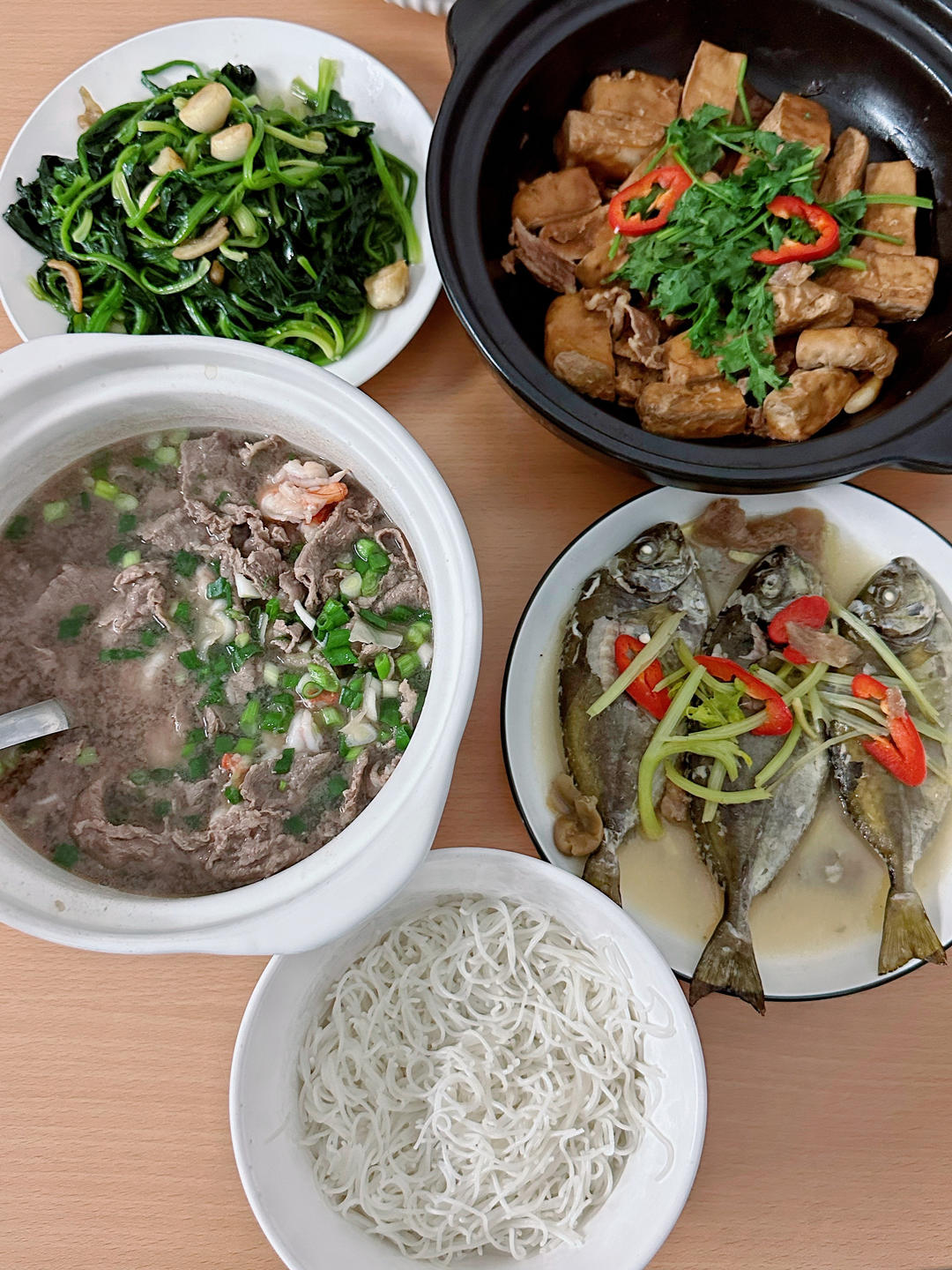 雪花海虾汤粉,豆干煲,泥猛鱼,菠菜。