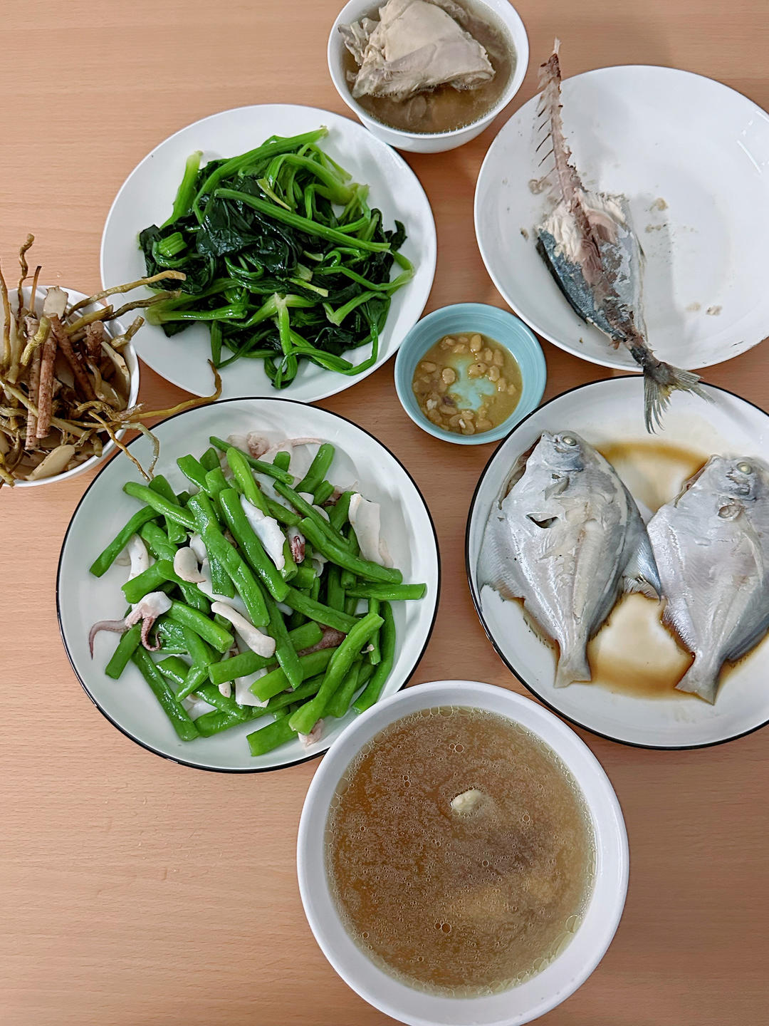 石斛麦冬五指毛桃玉竹鸡汤,白鲳鱼,鱿鱼四季豆,菠菜。