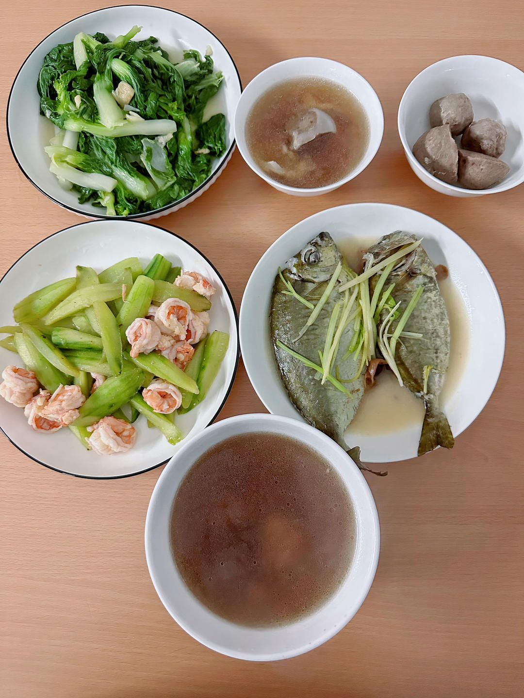 扇骨竹蔗罗汉果汤,泥猛鱼,虾仁青瓜,菜心,牛肉丸