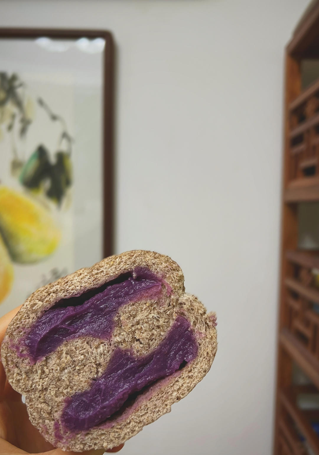 紫薯夹心面包完成✅,但是不够细腻,水多了,还有揉面不到位。配方是参考网上的。