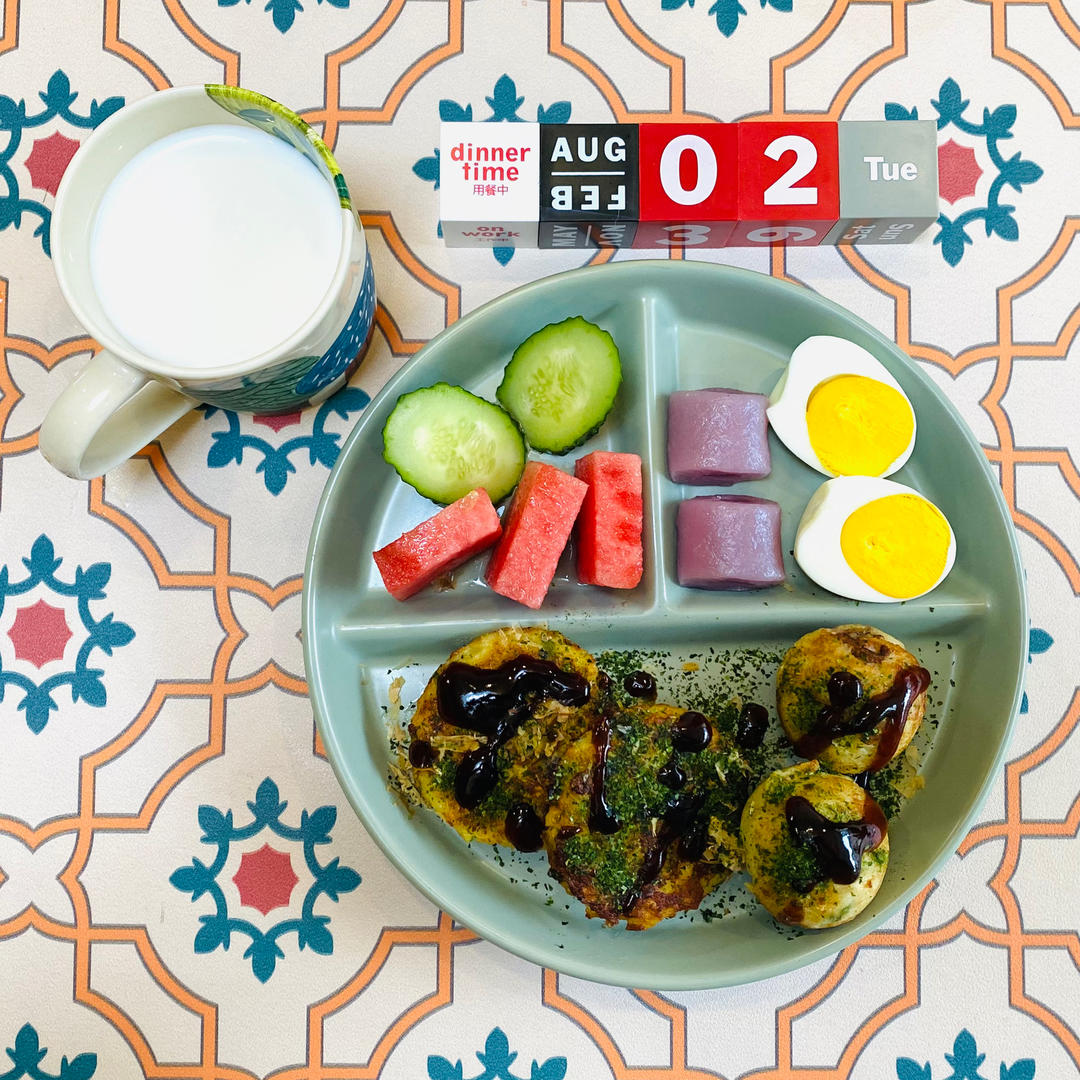山药厚烧、章鱼丸子、紫芋糕、黄瓜、西瓜、水煮蛋、鲜牛奶。