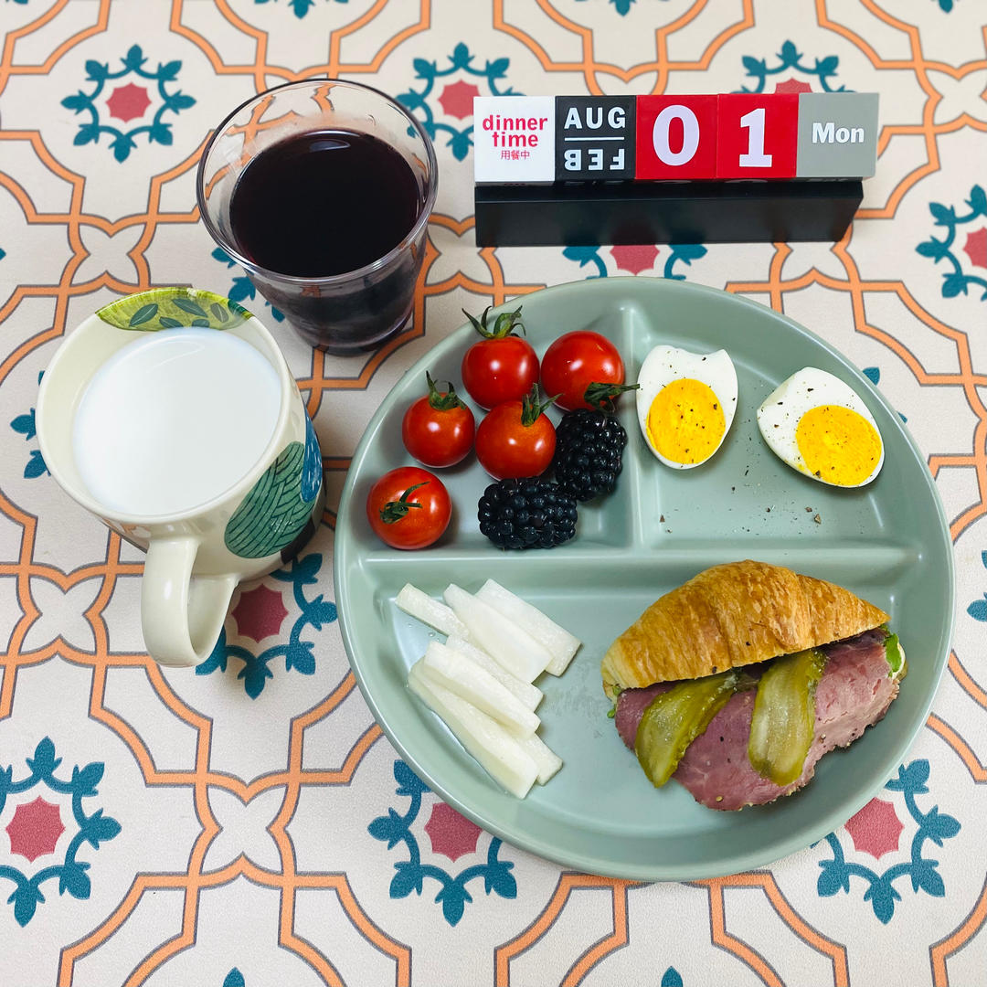 可颂三明治、糖醋萝卜、黑莓、小番茄、水煮蛋、酸梅汤、鲜牛奶。