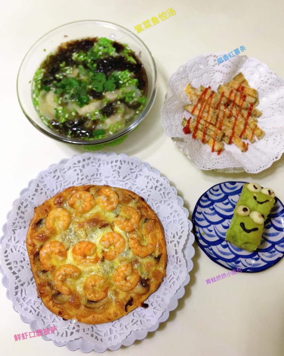 今天的午餐:鲜虾口蘑披萨➕紫菜鱼饺汤➕椰香红薯条➕青蛙挤挤小面包