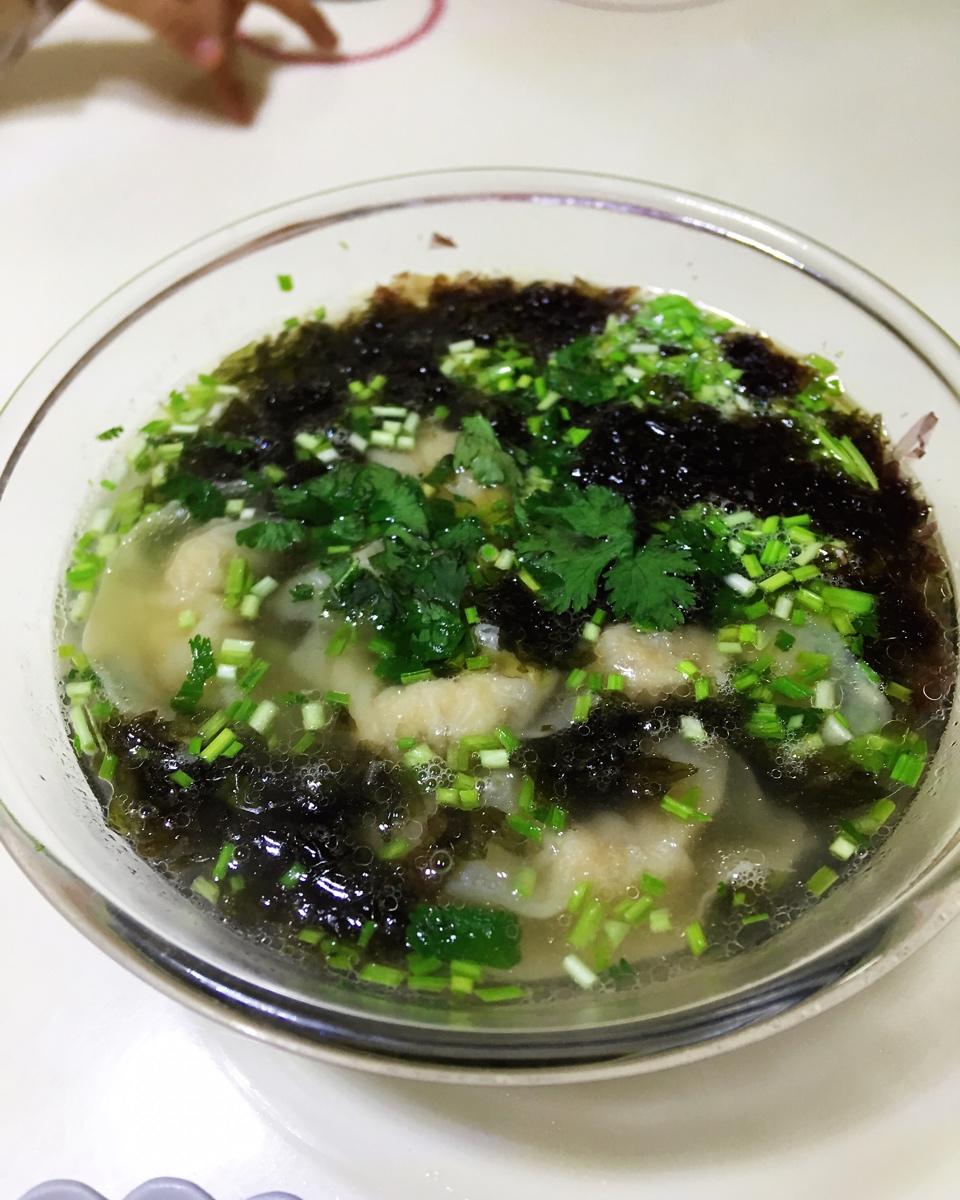 鱼饺紫菜汤,加了特制的高汤,剪了一把花盆里栽种的蒜苗,味道鲜美极了