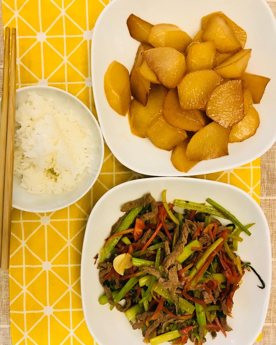 上周和儿子的晚饭:清炒油菜,糖醋排骨,西红柿鸡蛋汤。