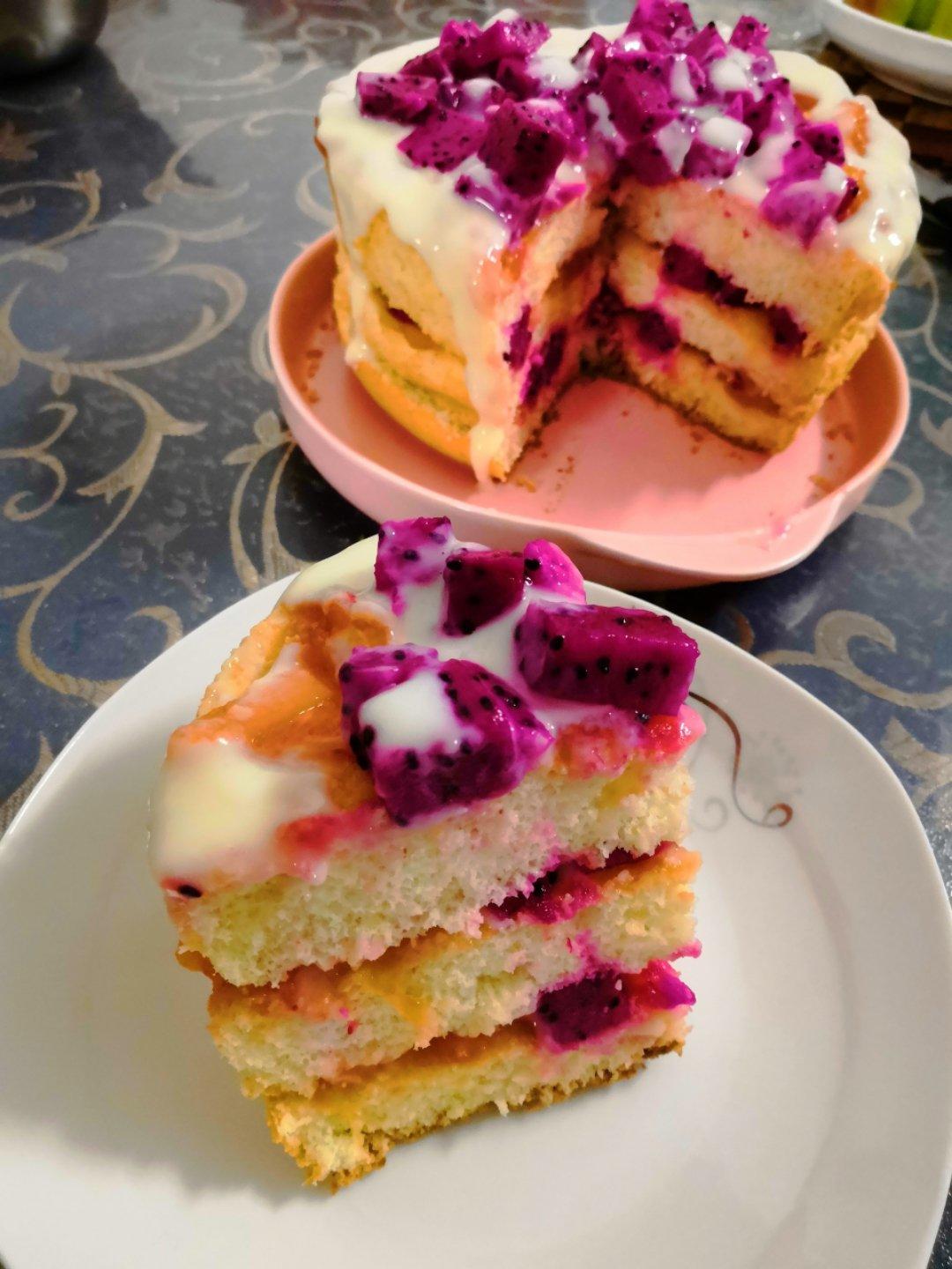 第二次做戚风蛋糕,用的百分百全麦粉和脱脂奶粉加的代糖,然后用自己熬的木瓜酱,自缺卡达酱,火龙果,也算处女...