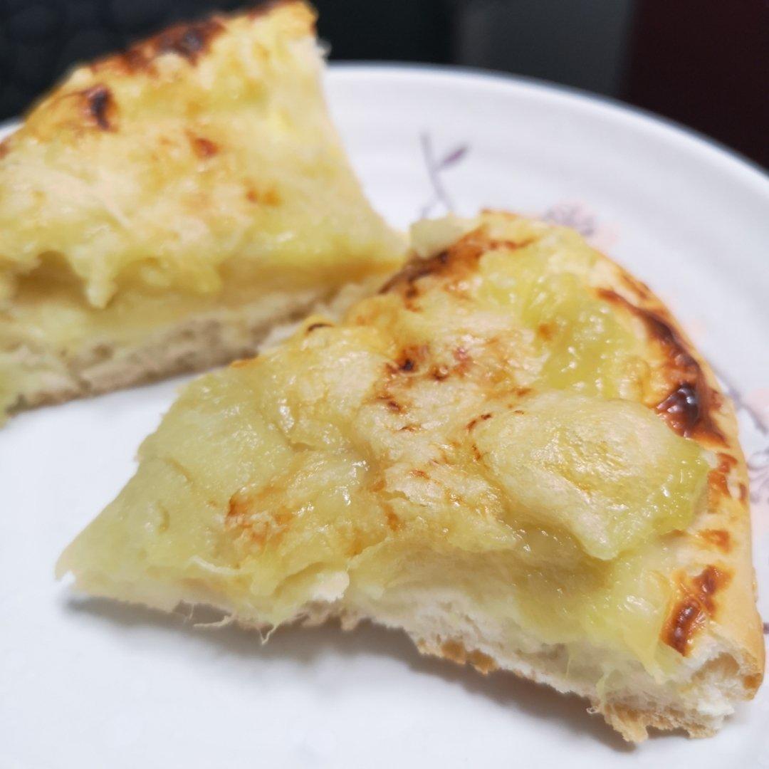 没有普通面粉了,用的低筋面粉加高筋面粉混合约140g做的面饼。金枕榴莲一小碗,凤梨粒一丢丢,加上马苏里奶酪。烤出来很香很...