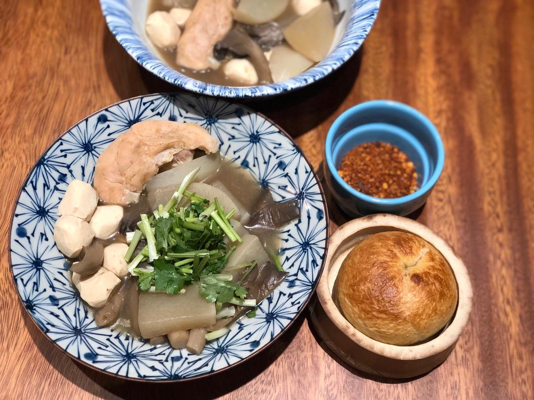 自制低油低糖瞎眼红薯贝果,无油无盐牛肉清汤煮白萝卜平菇和鸡肉丸子。