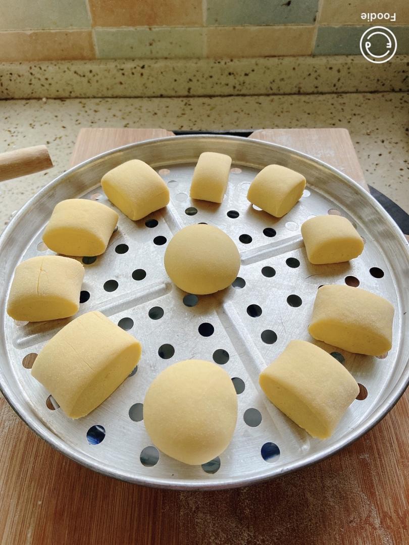 玉米面馒头,多揉一下蒸出来应该会更暄软更光滑~