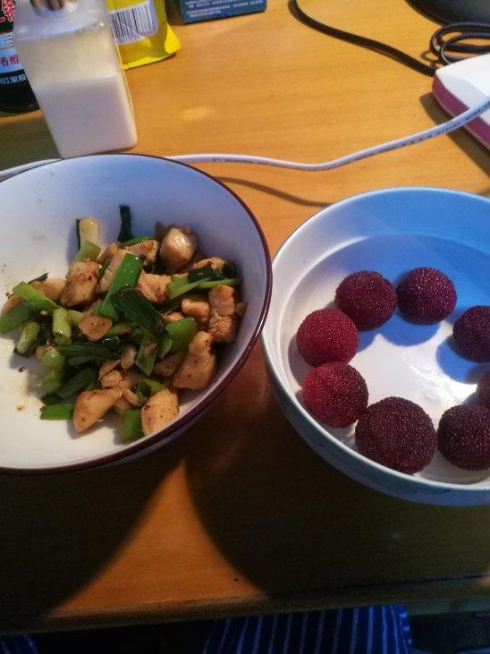 没有鸡腿肉了,用鸡胸肉凑合。吃不得太多辣椒,只放了两根,出来还不错。配合着杨梅当夜宵真是美吱吱。