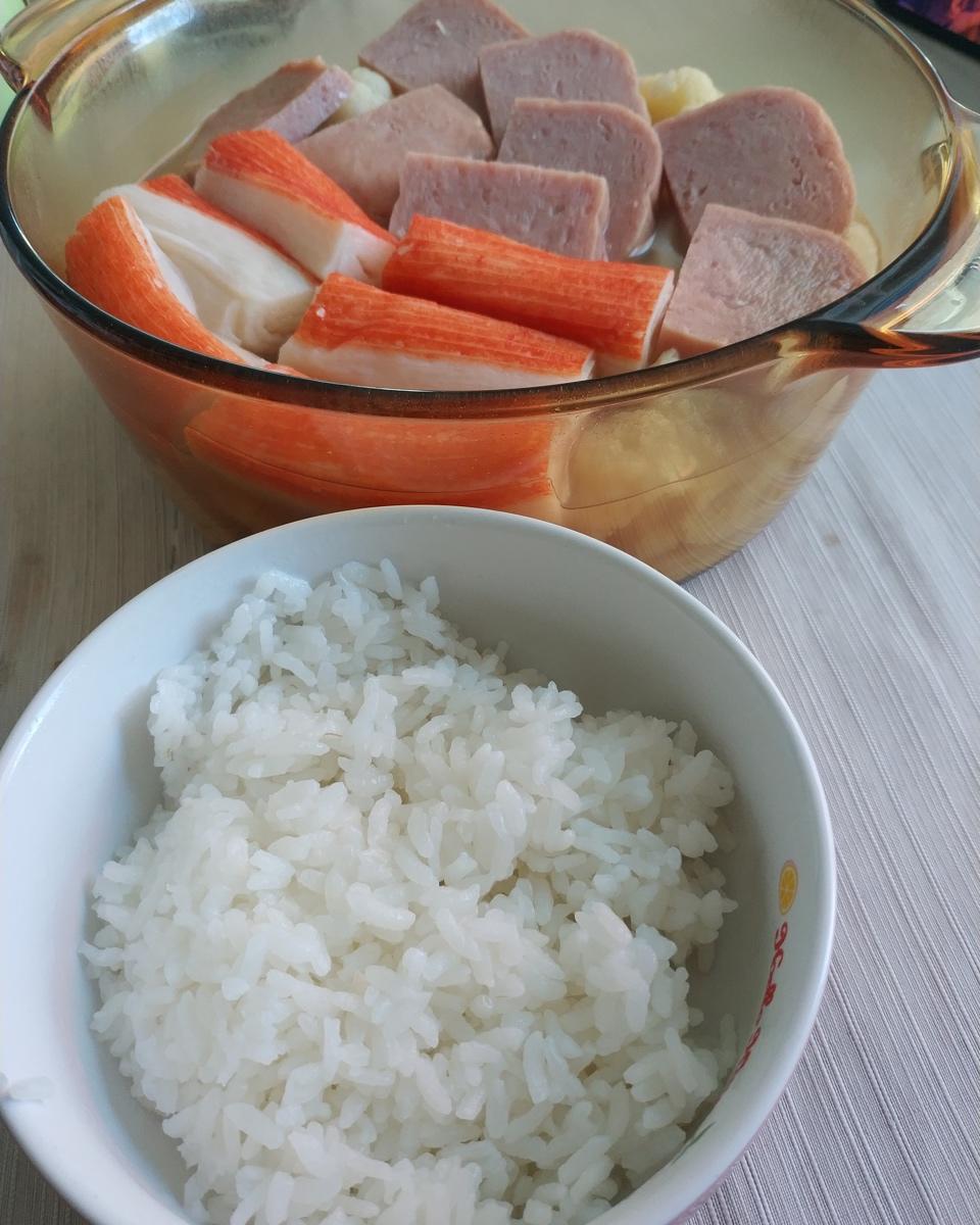 表面铺满了午餐肉和蟹肉棒,底下还有大白菜,花菜和冻豆腐。超满足的一个炖菜😋😋