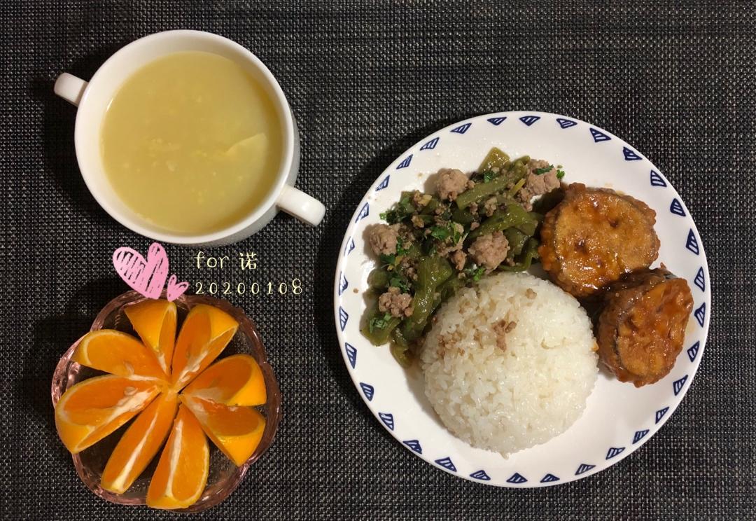 补发早餐:本周第三次吃茄盒、炒丝瓜、爸爸从陕西背回的米脂小米(女只喝米汤)