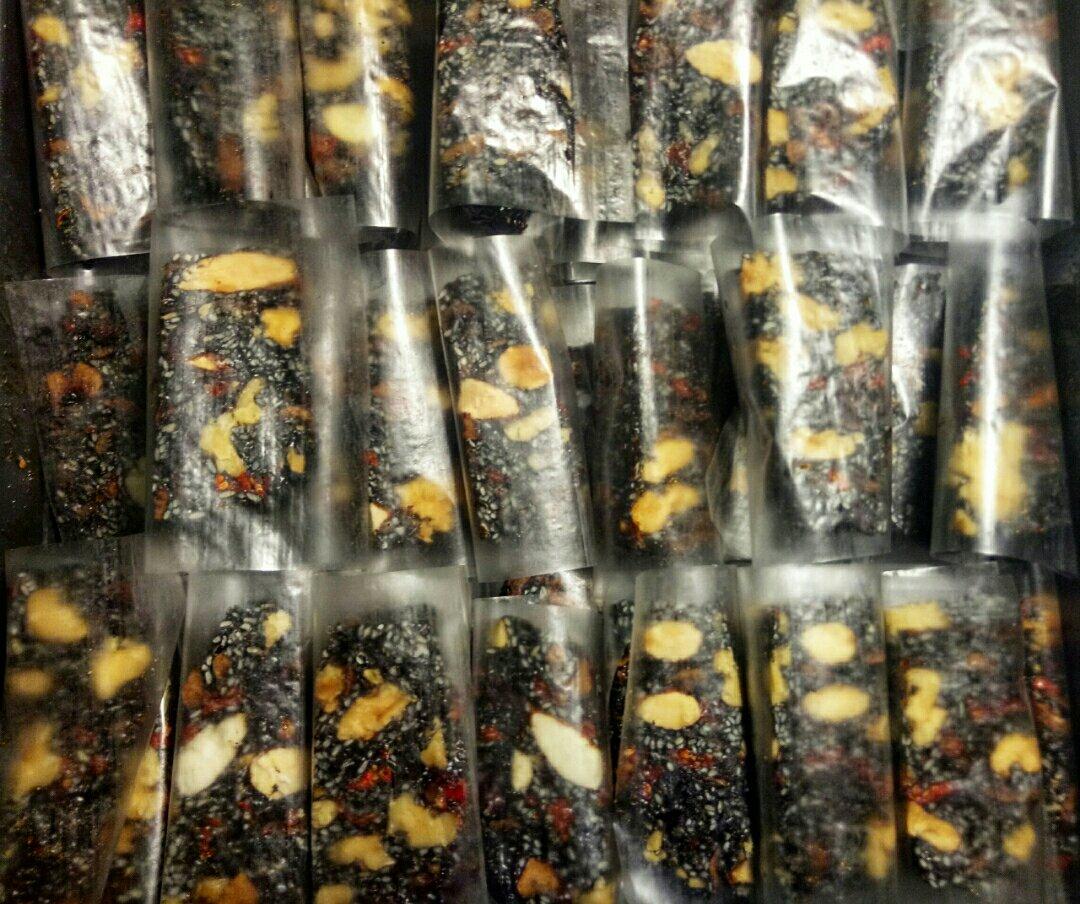红枣,核桃,黑芝麻,枸杞,美国大杏仁,蔓越莓熬出来的,每天两块,吃出健康