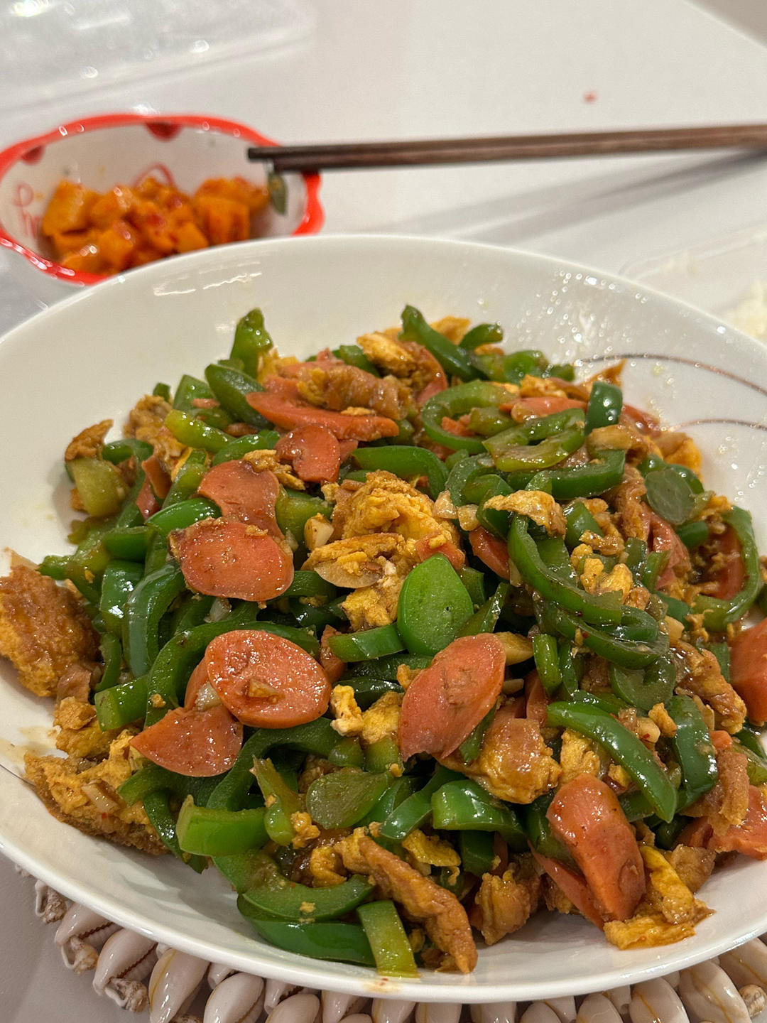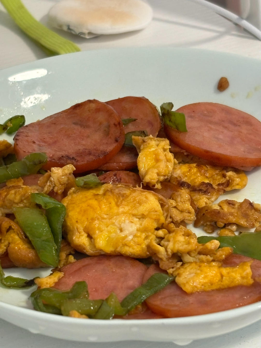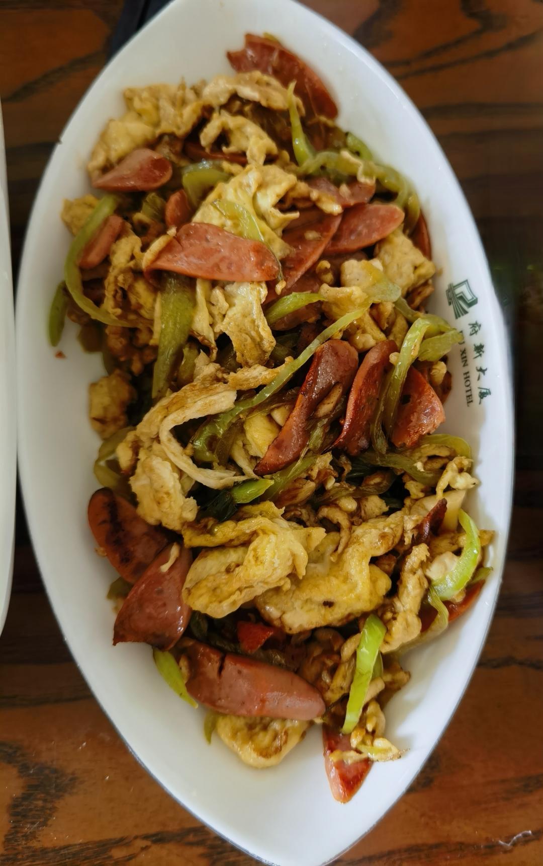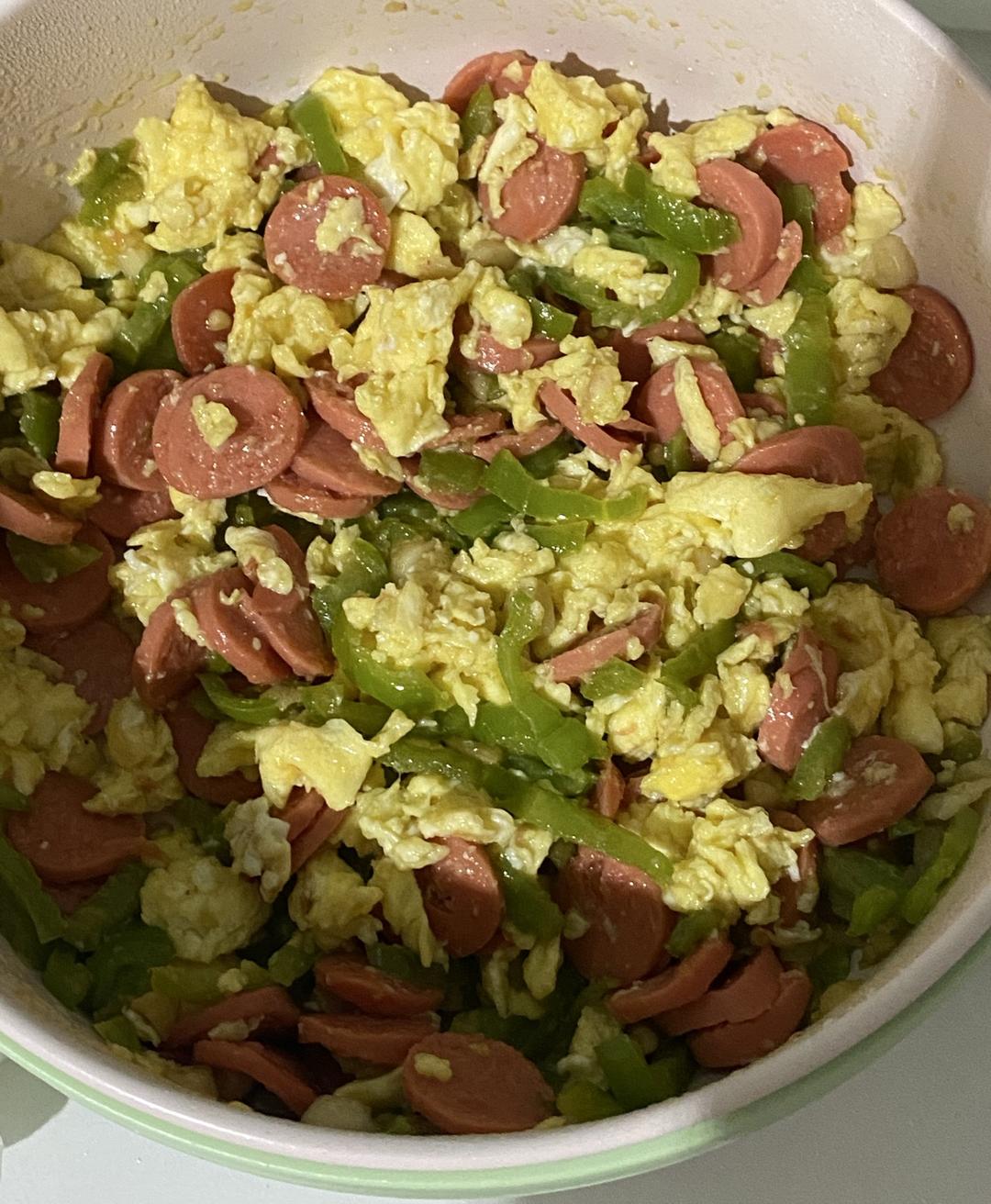 今天这道菜是在青椒炒蛋的基础上加了火腿肠,此外今天没放酱油,而是用老干妈代替(一看几者搭配效果如何,二还是要调色☺️)