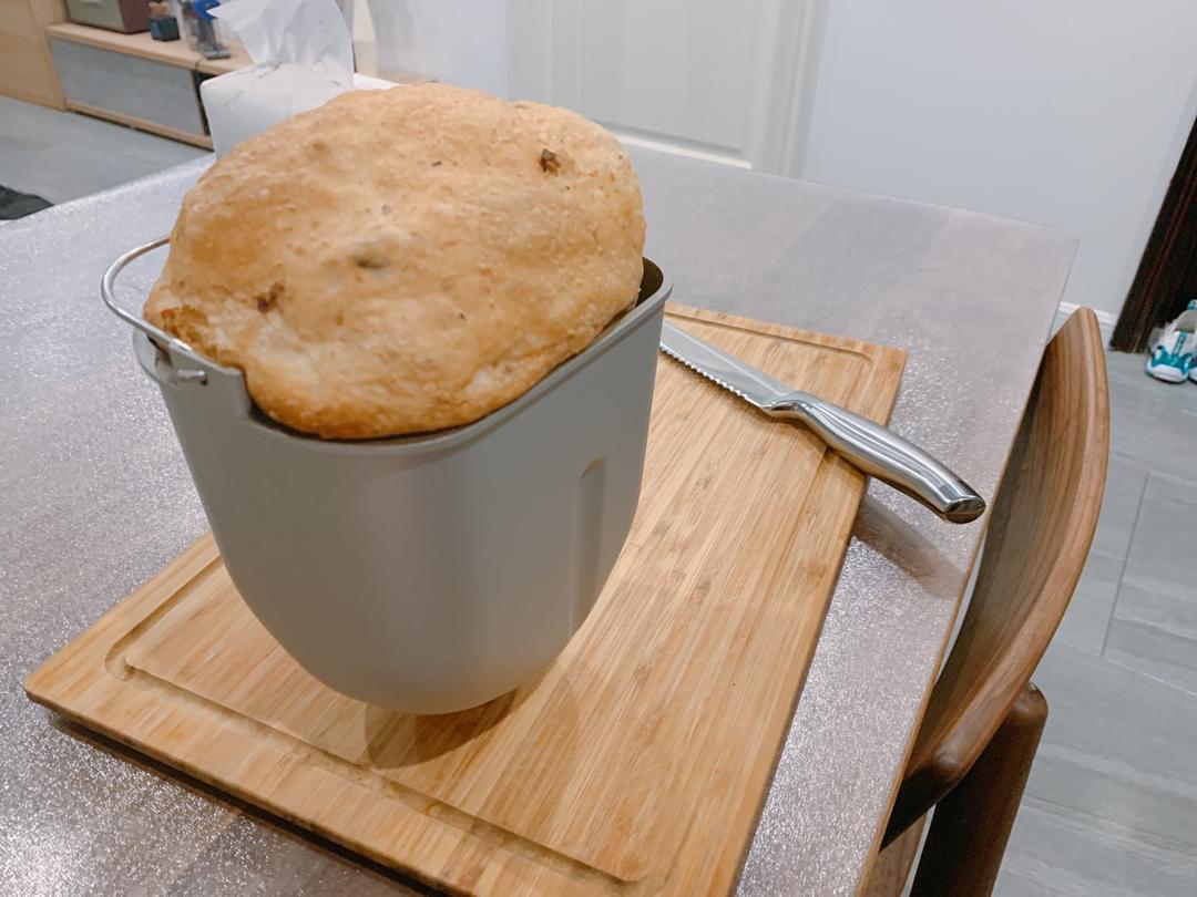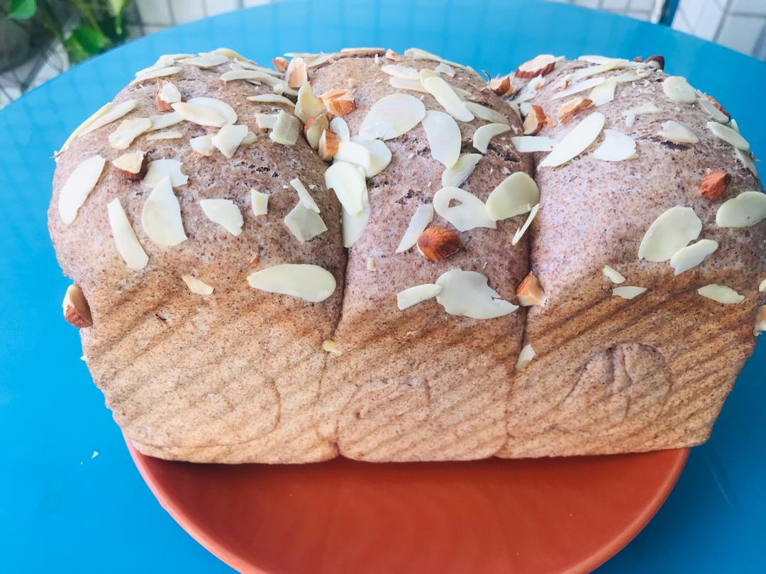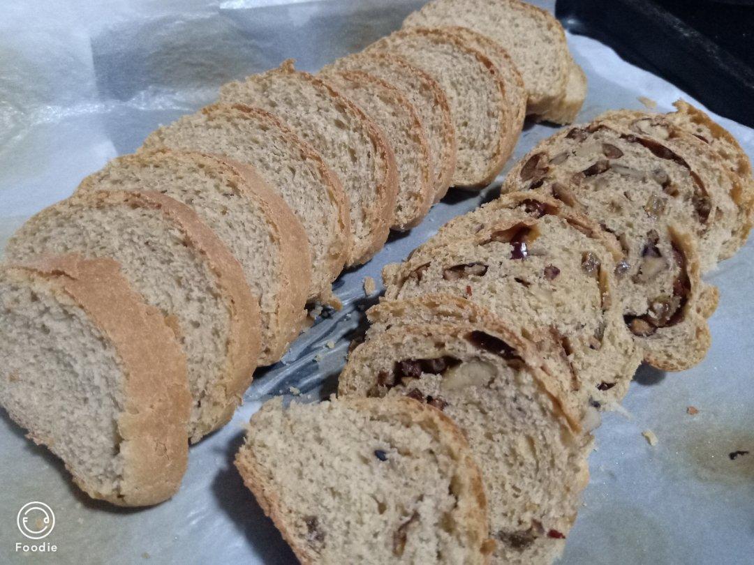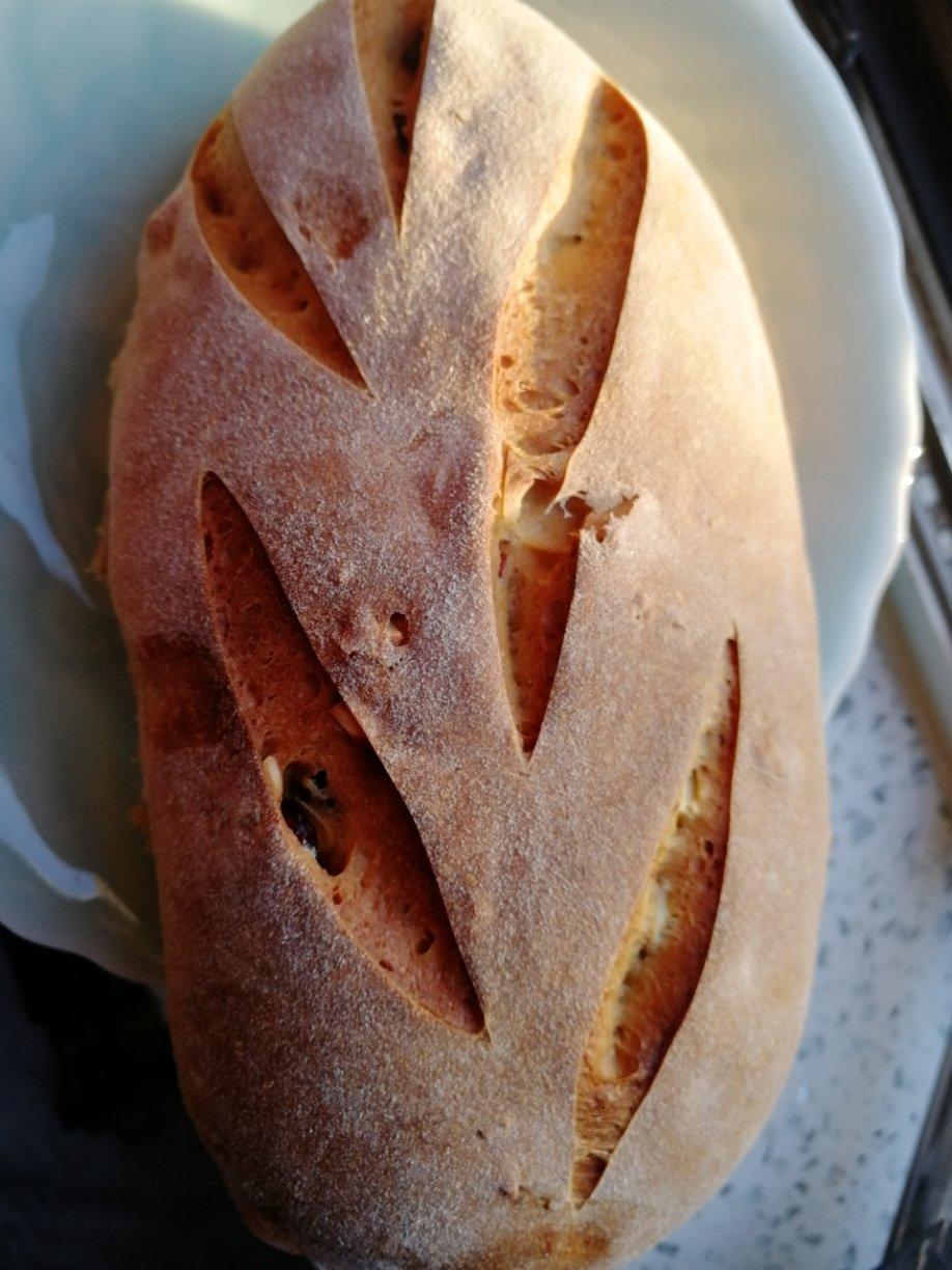 1.5倍的量,一半高粉一半全麦,水换成牛奶,565克液体量,200克核桃,100克蔓越莓,6✖️350克,200℃,22...