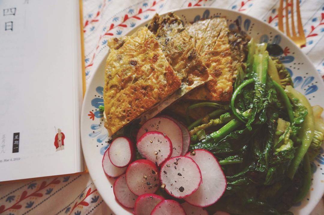中午想做牛排结果忘了化冻,只能吃素点了,香椿芽鸡蛋饼,炒乌塌菜和芥兰(疑似,不太认得菜…) #午餐•2019年3月...