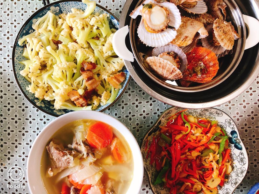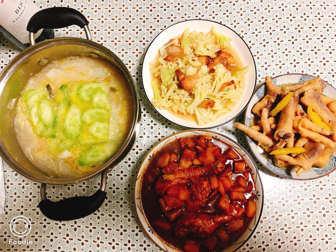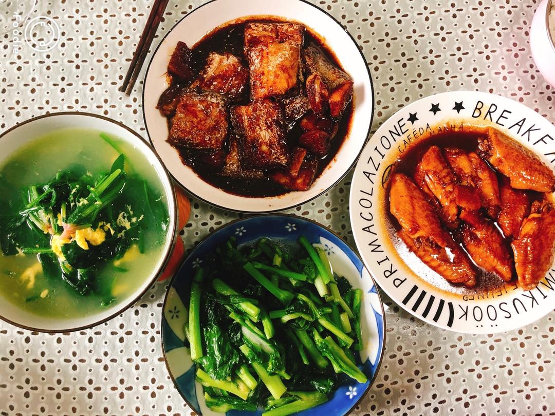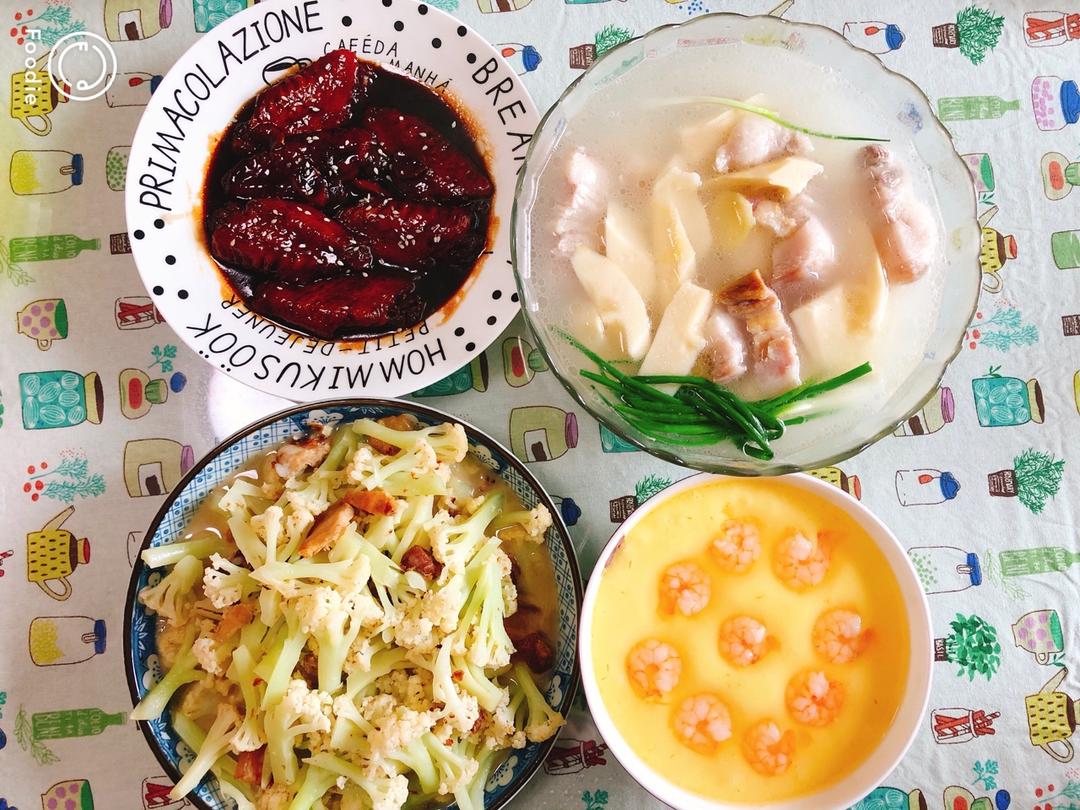 可乐鸡翅,腌炖鲜,虾仁炖蛋,清炒白花菜,把想做的都做了一遍,满足了。