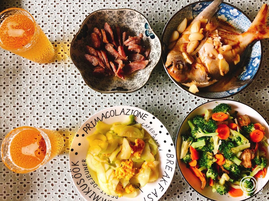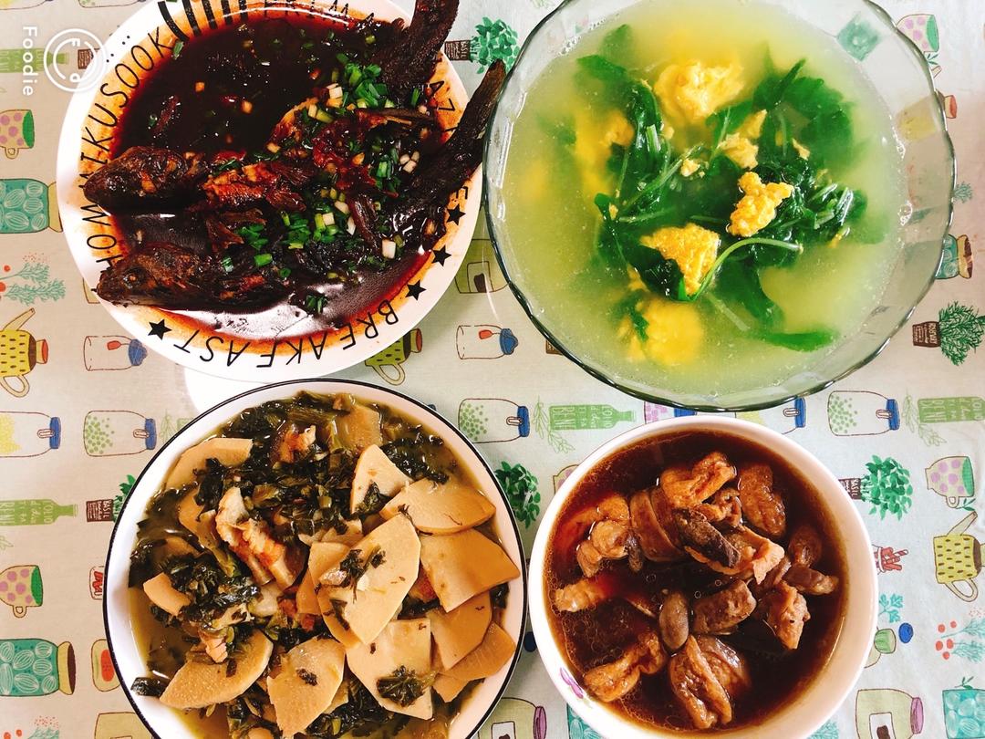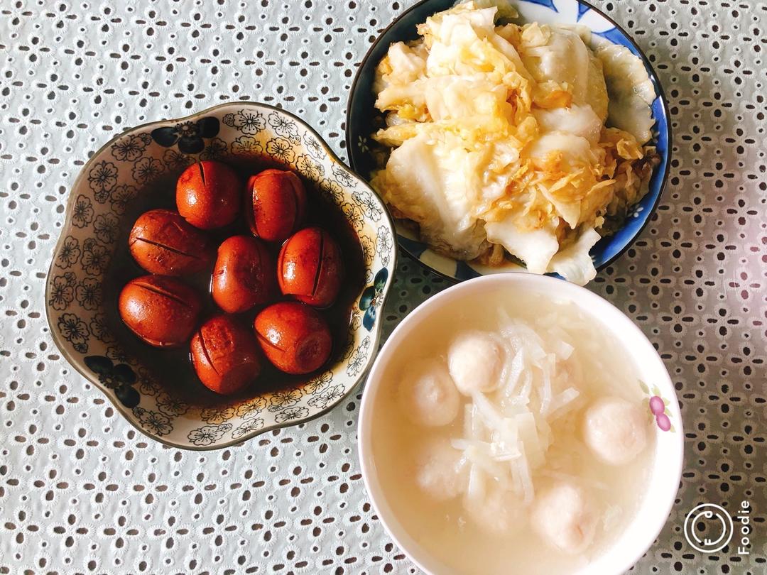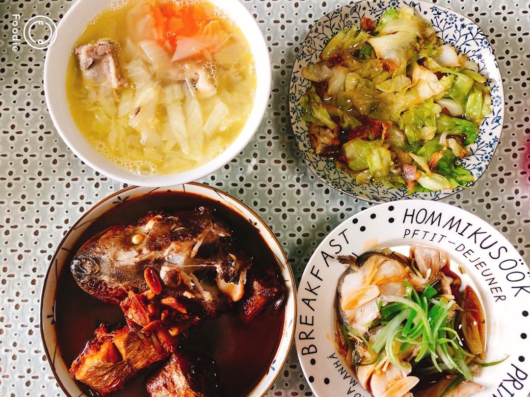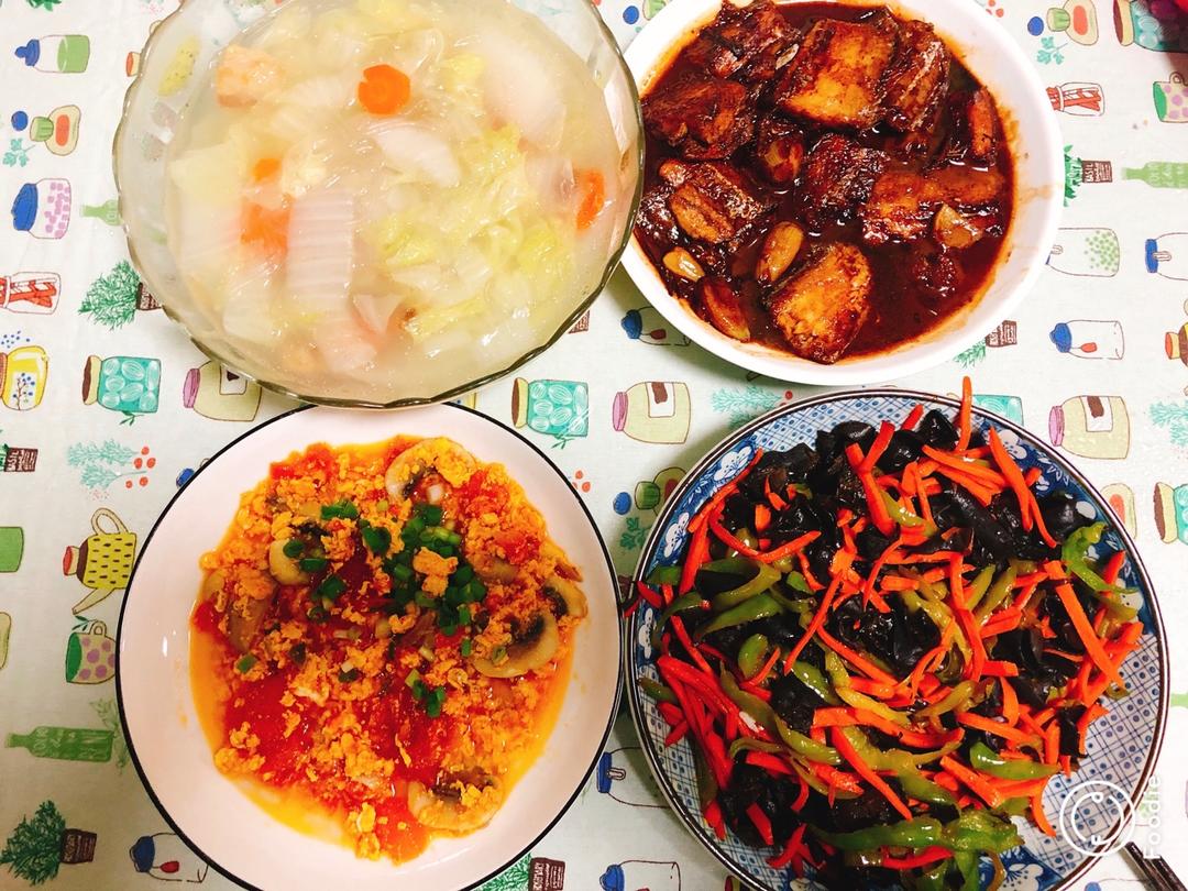 可乐鸡翅,腌炖鲜,虾仁炖蛋,清炒白花菜,把想做的都做了一遍,满足了。