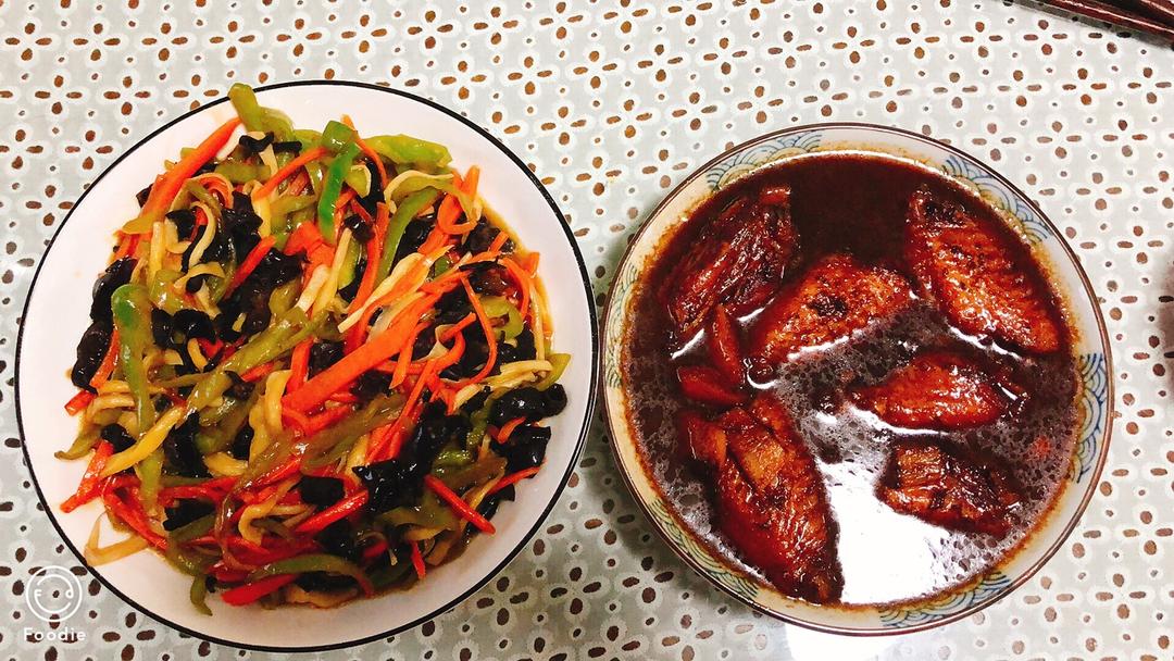娘俩的晚餐,鱼香杏鲍菇丝,可乐鸡翅。