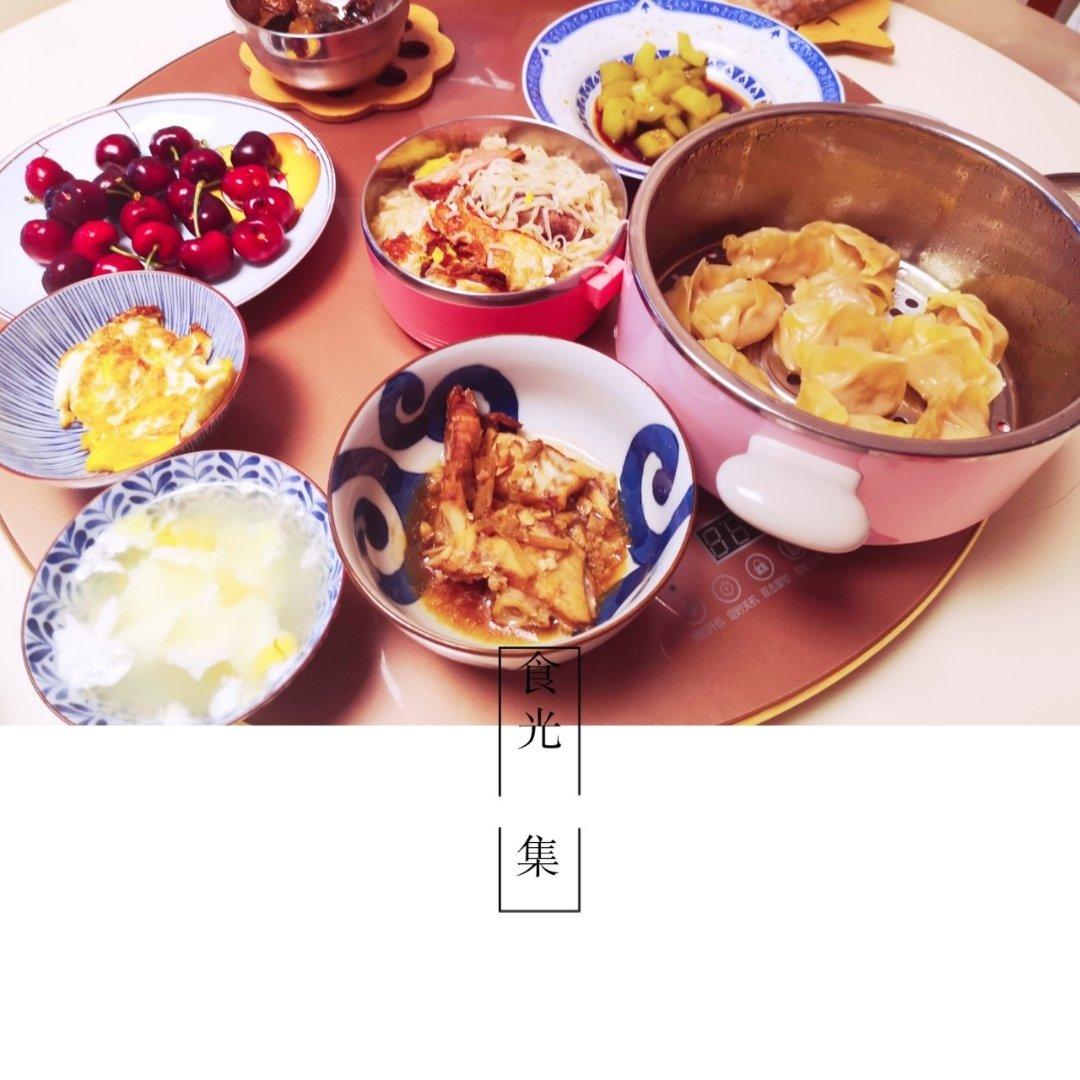 2019.6.11 煎蛋,蒸饺,酱油水鱼,樱桃,稀饭,荷包蛋汤,拌黄瓜,大骨汤面