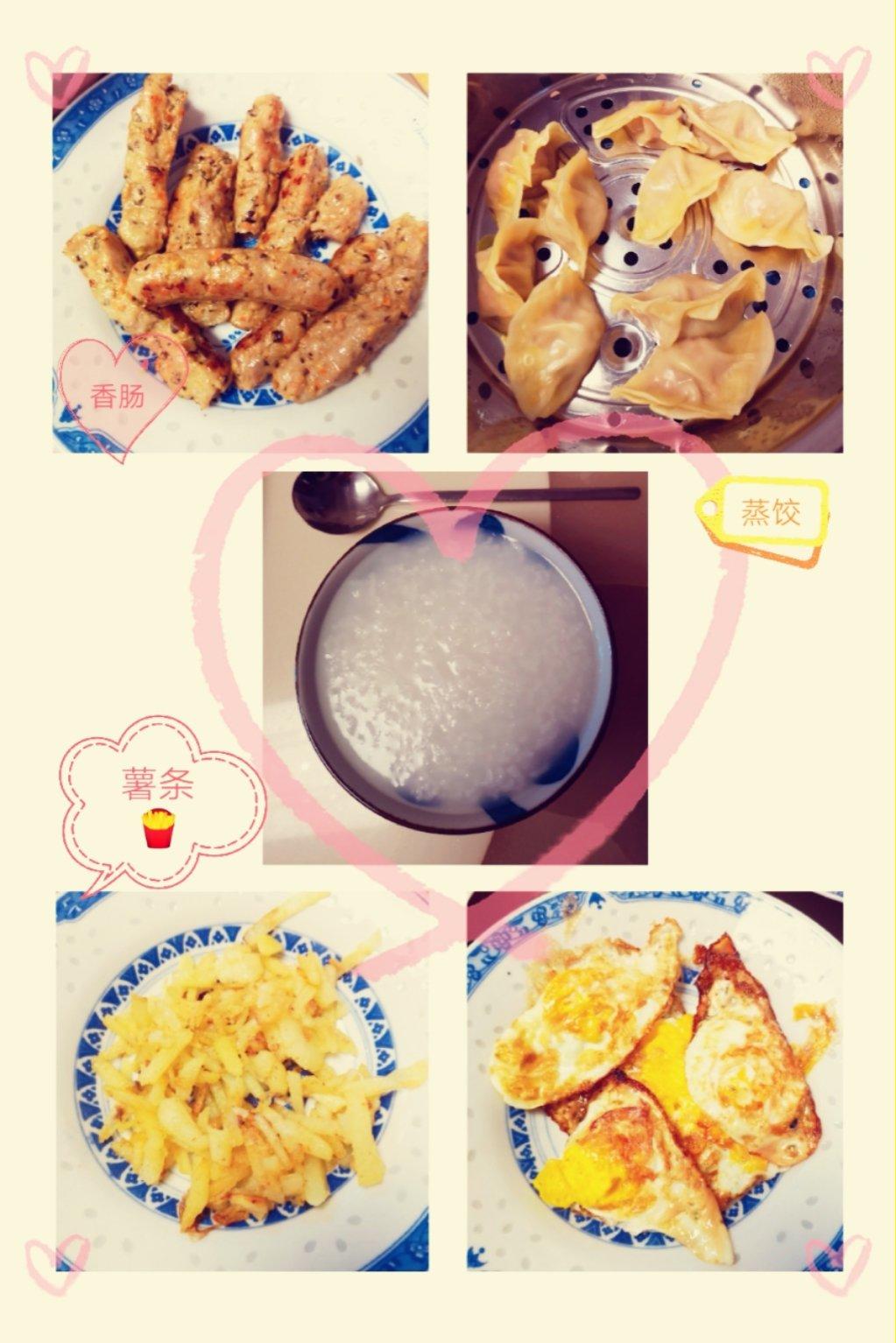 自制香肠+蒸饺+煎蛋+薯条+稀饭