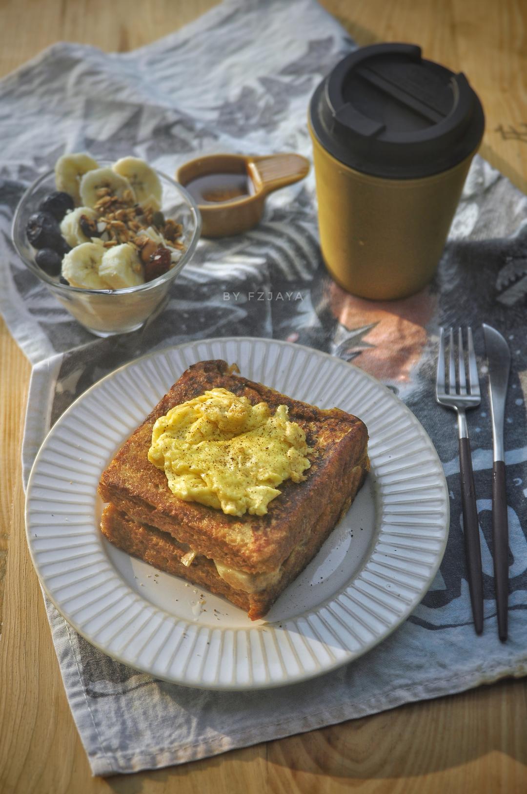 香蕉花生酱芝士西多士,美式炒蛋,香蕉蓝莓坚果燕麦易极优酸奶。浇上蜂蜜,蘸炼乳,高热量活力满满的一餐#享瘦生活!yummy...