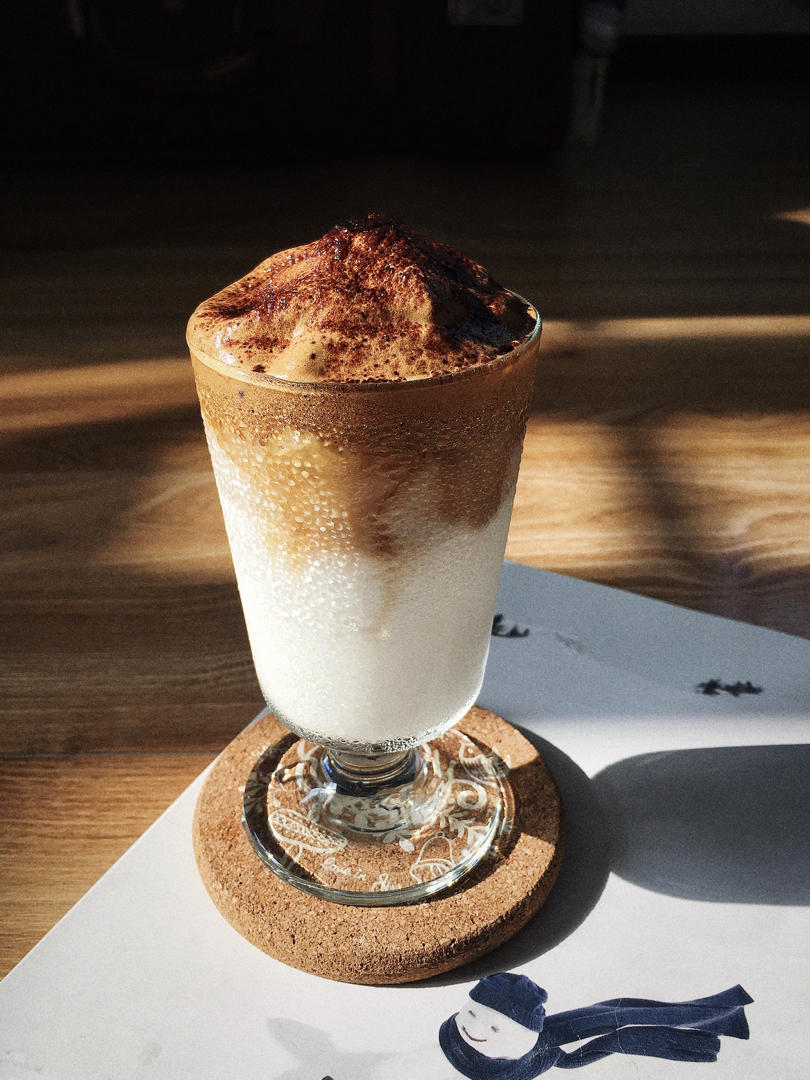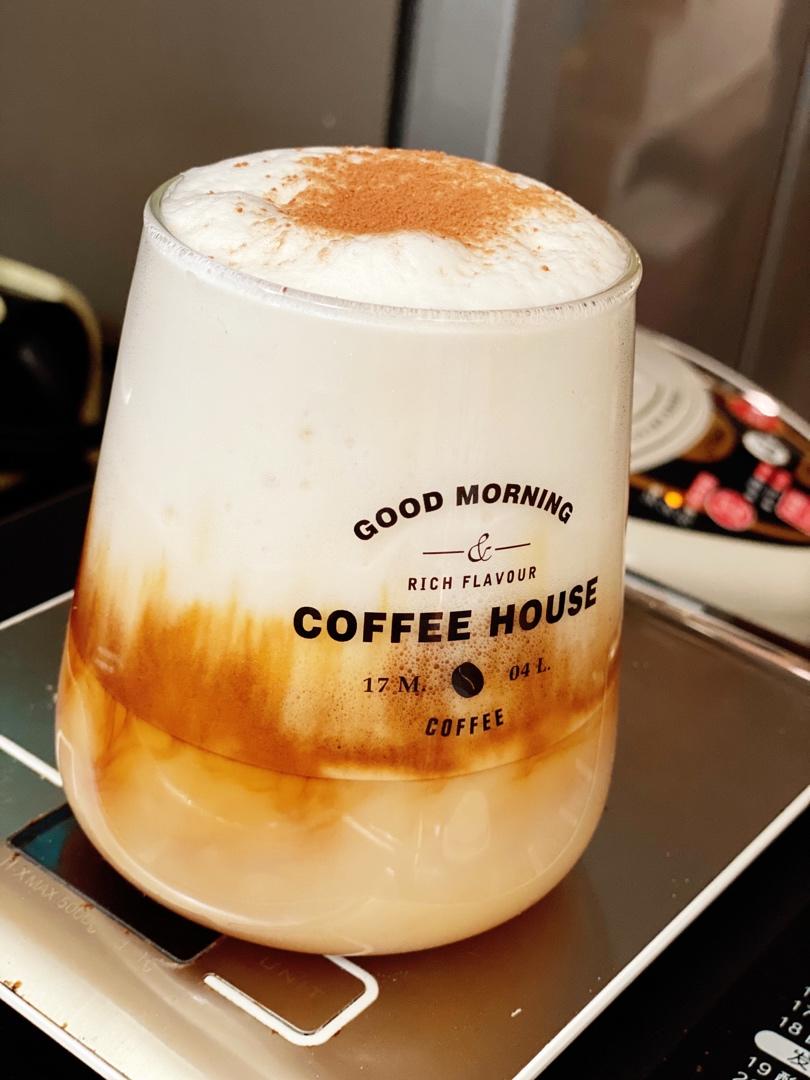做了分层,把牛奶也打发了~最下层牛奶中间咖啡上层牛奶泡沫,撒上可可粉