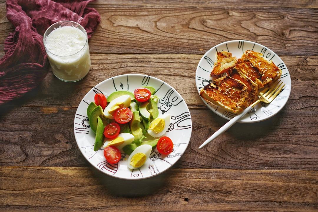 早餐,鸡蛋牛油果沙拉,腐乳烤馒头片,牛奶。