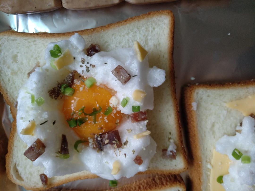 做了个芝士火腿卷,剩下的边角料炒了个蛋,煎了个面包边~
