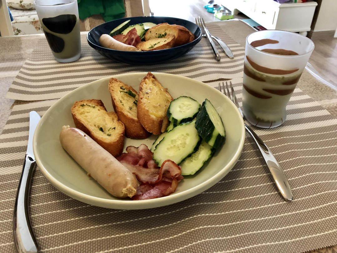 周末早起的动力就是吃一顿丰盛的早餐!法棍香肠培根黄瓜拼盘,配抹茶拿铁~原谅色的brunch