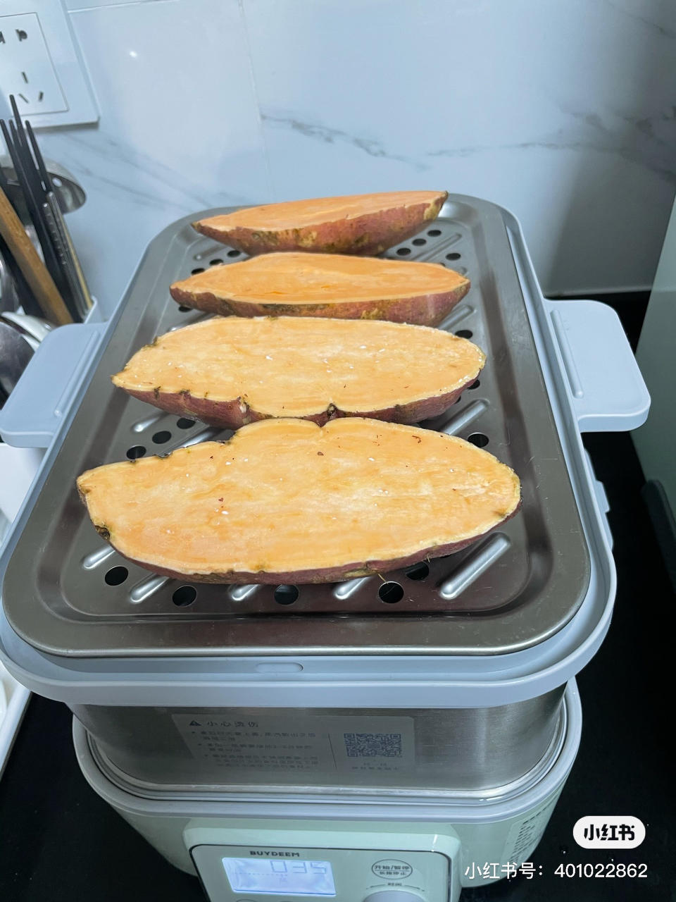 芝士酸奶焗红薯,用到了我家的北鼎蒸锅和烤箱。
