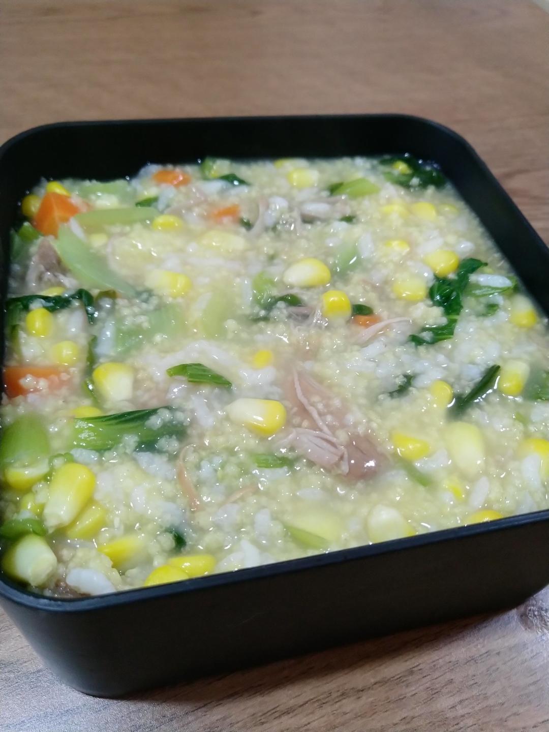 玉米胡萝卜青菜鸭胸肉丝粥
