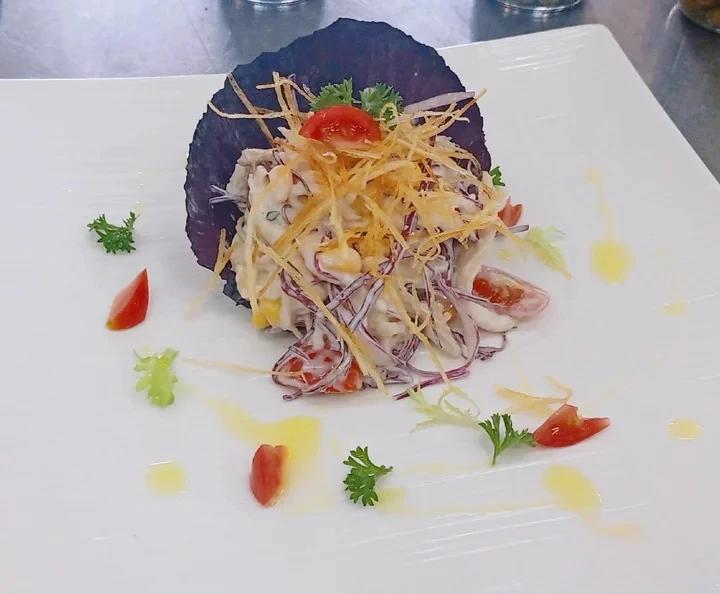 鸡胸肉100克、土豆200克、紫甘蓝100克、甜玉米粒50克、蛋黄酱50克、牛奶30毫升。蒜、洋葱、百里香适量。 #西餐...