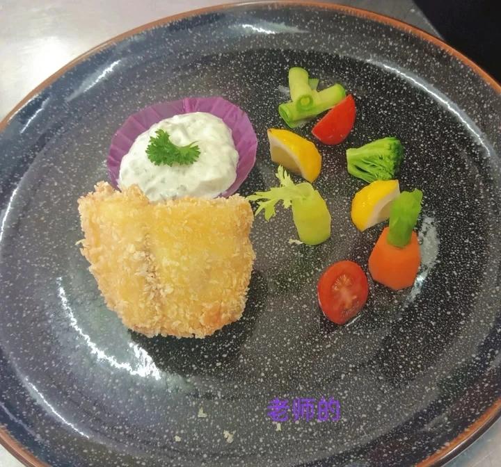 龙利鱼150克、鸡蛋1个、面粉、生粉各30克、柠檬1个、蛋黄酱50克、酸青瓜、水瓜柳、洋葱、法香适量、九芽生菜、小番茄、...
