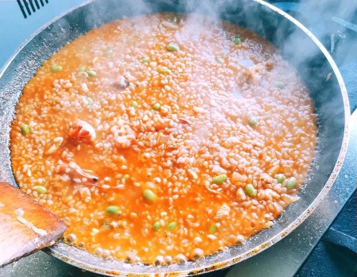 材料:青口、珍珠米、鸡胸肉、青豆(豌豆)、蒜、洋葱、虾