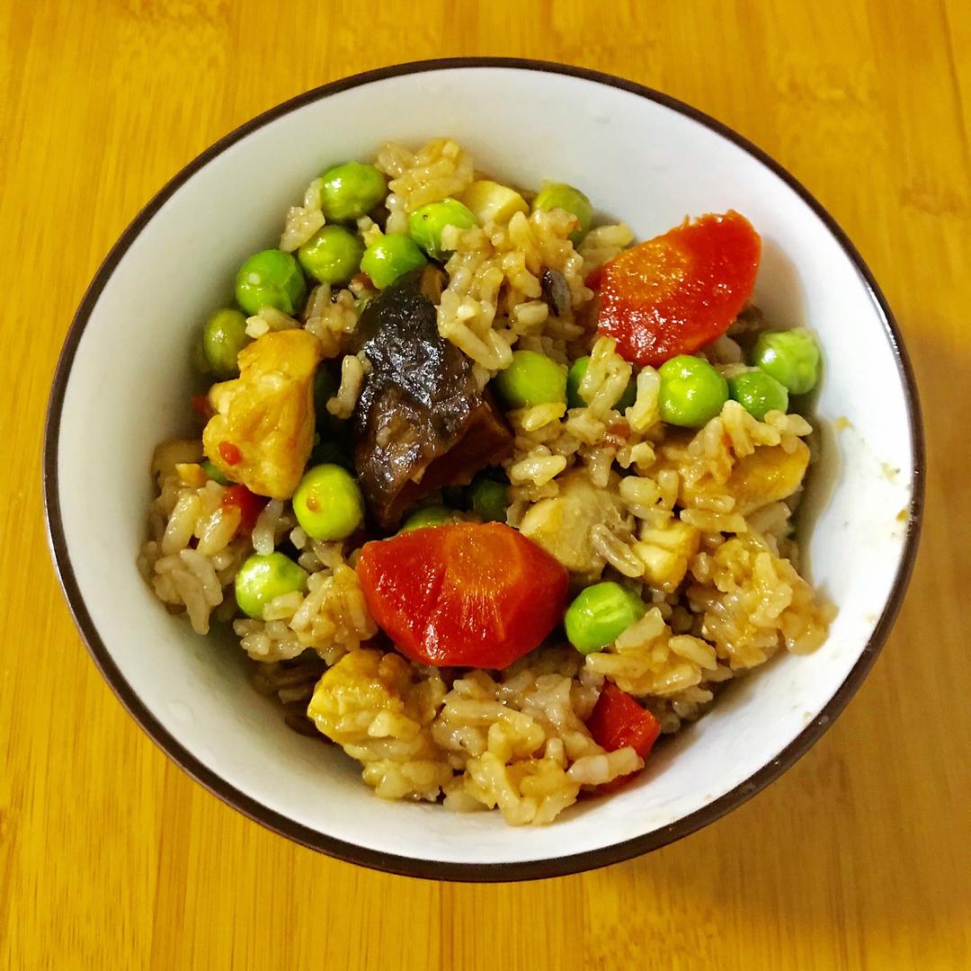 豌豆胡萝卜🥕香菇鸡肉饭+玉米花胶鸡汤+炒大白菜