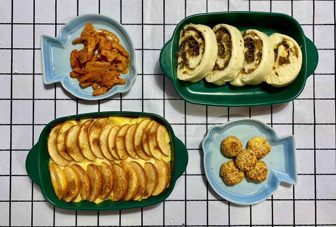 早安 !苹果烤吐司,肉龙。蛋黄酥,守嘴狗。