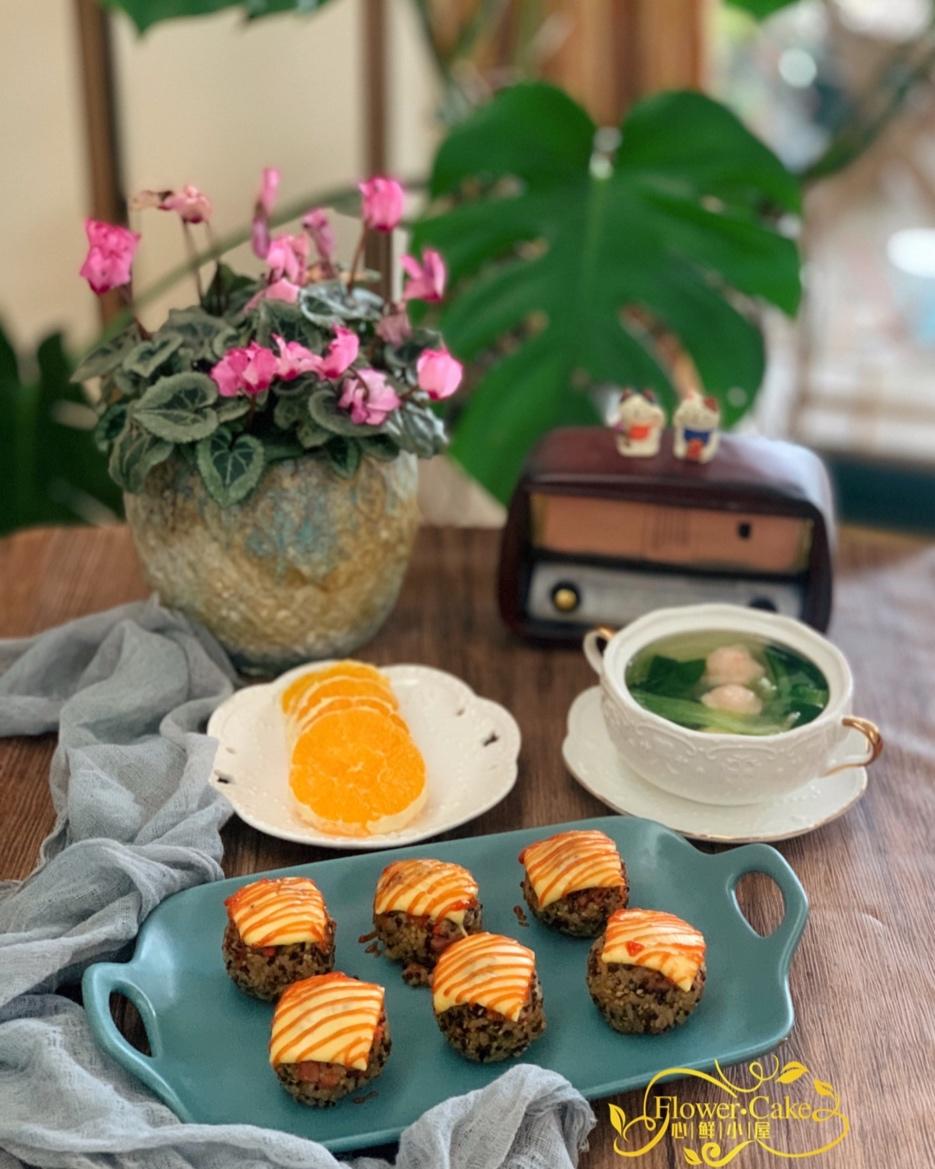 今日份早餐:三色藜麦芝士饭团➕胡萝卜虾丸汤➕水果