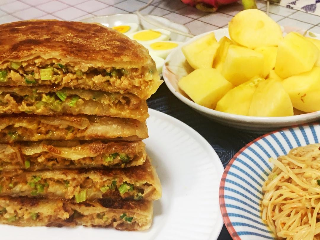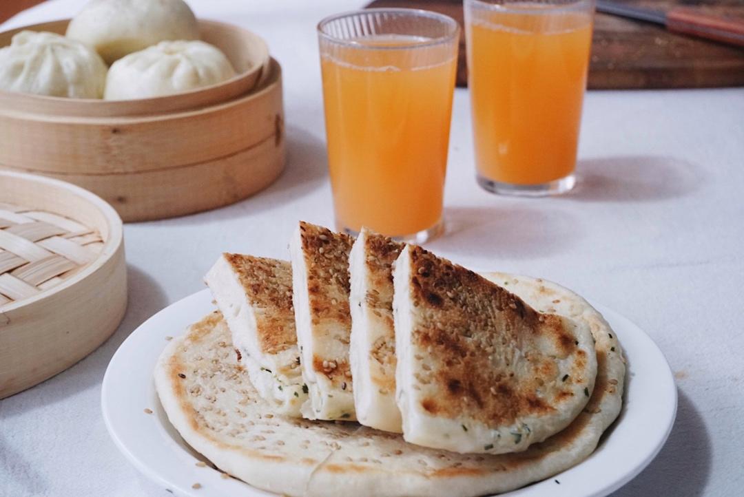 昨天小宝折腾了一夜😭早上简单食:葱油发面饼.菜包&胡萝卜苹果热饮