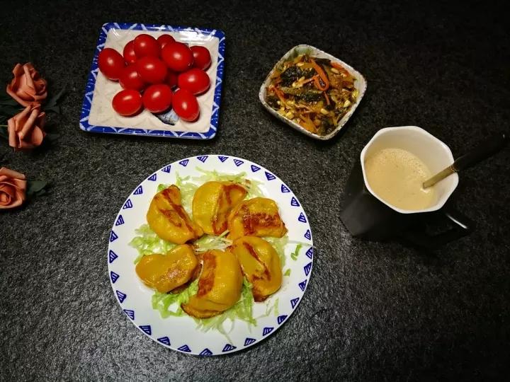 南瓜皮荠菜猪肉煎饺•ᴗ•咖啡椰奶•ᴗ•圣女果•ᴗ•什锦菜