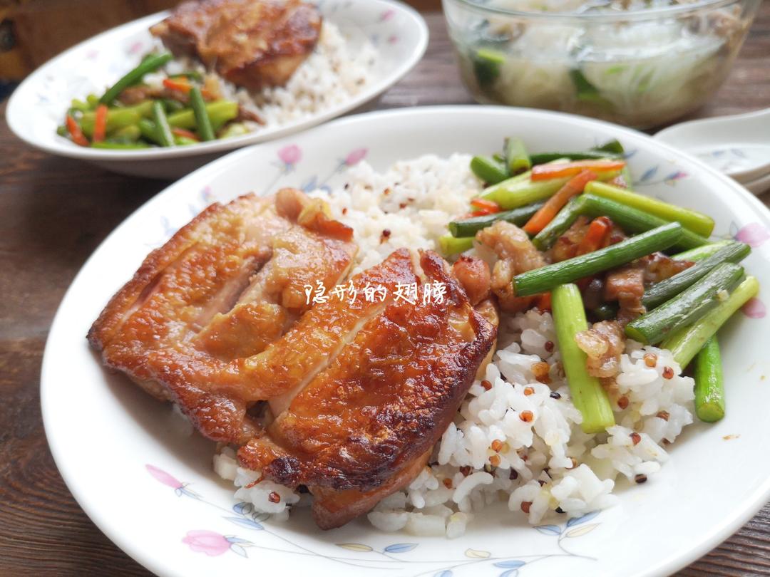 自己做的,食材成本很低(蒜苔是用煎鸡排时挤出来的油炒的,汤是从鸡腿排上剔下来的骨头添水熬的...