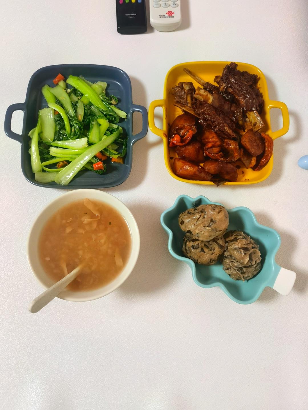海米小油菜,土豆炖羊排,红薯叶子窝窝,胡辣汤