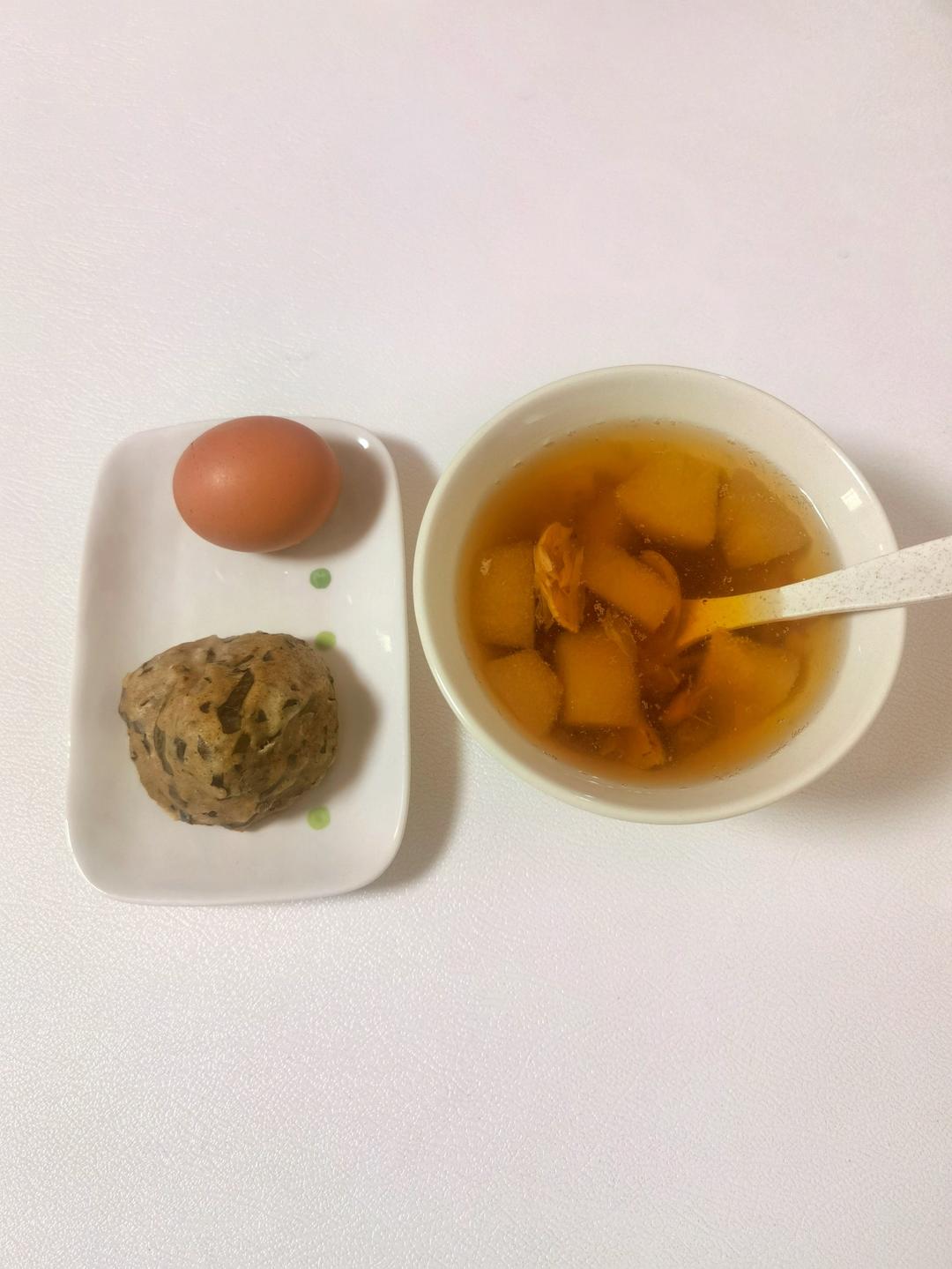 红薯叶杂粮窝窝,水煮蛋,银耳雪梨汤