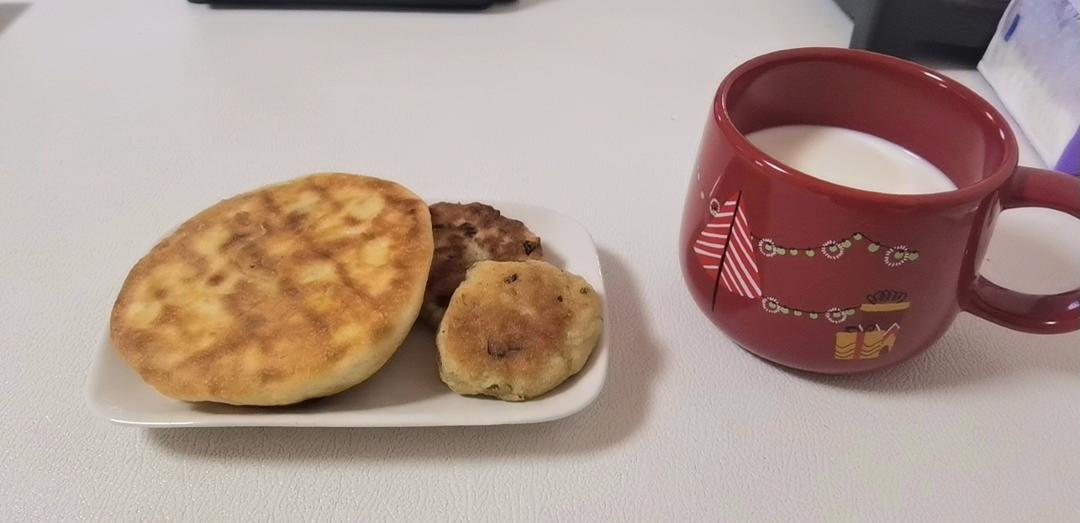 韭菜肉饼,豆腐渣鸡蛋饼,牛奶,居家隔离第六天