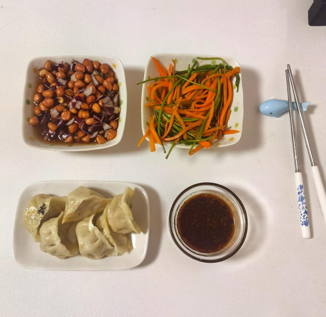 老醋花生,胡萝卜炒红薯梗,煎水饺