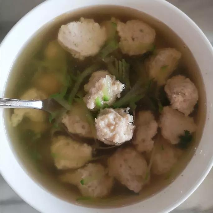 鸡肉丸子汤~一块鸡胸肉、大葱搅碎,放入将近2小勺盐,适量料酒,一个蛋清,一点淀粉搅匀。水烧至大约90度放入鸡肉丸,肉丸漂...