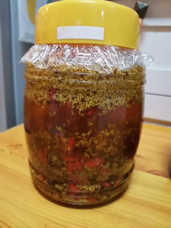 第一次做桂花放太多,中途换了一个瓶子,又加了一斤半酒,现在颜色看着很漂亮