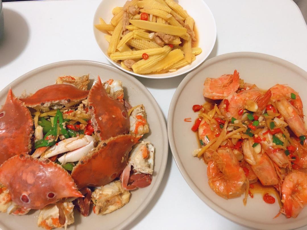 姜葱炒蟹、香辣基围虾、玉米笋炒肉