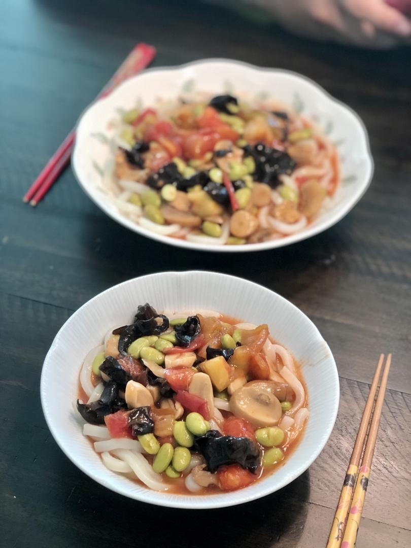 西红柿打卤乌冬面。天气炎热,做碗打卤面吃吃。冰箱里没鸡蛋了,就地取材找了几样冰箱橱柜里有的...
