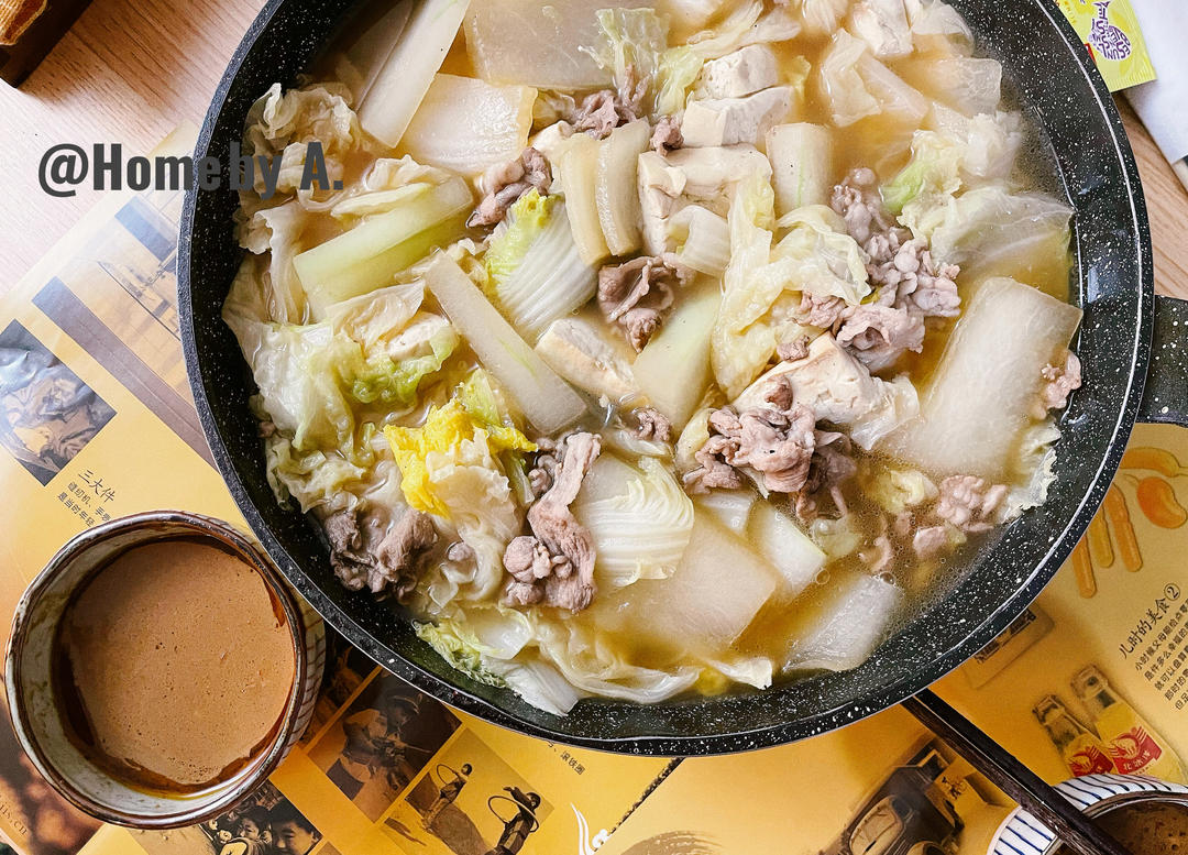 炒菜锅一大锅,做好直接端上桌,搭配麻酱火锅蘸料开吃~
